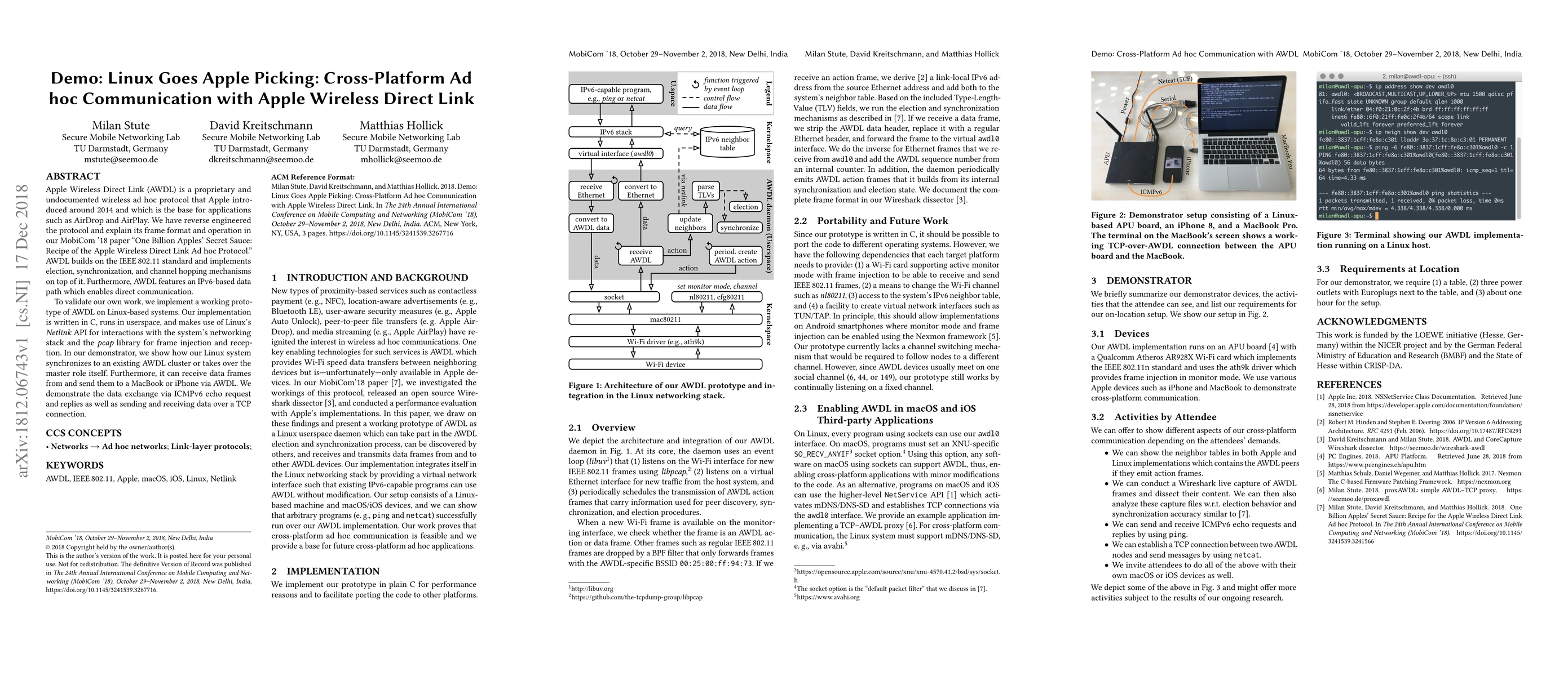 This paper details the reverse engineering of Apple's proprietary AWDL protocol, which underpins Apple's AirDrop and AirPlay. The authors implement a working AWDL prototype on Linux, demonstrating cross-platform ad hoc communication and data exchange via ICMPv6 and TCP.