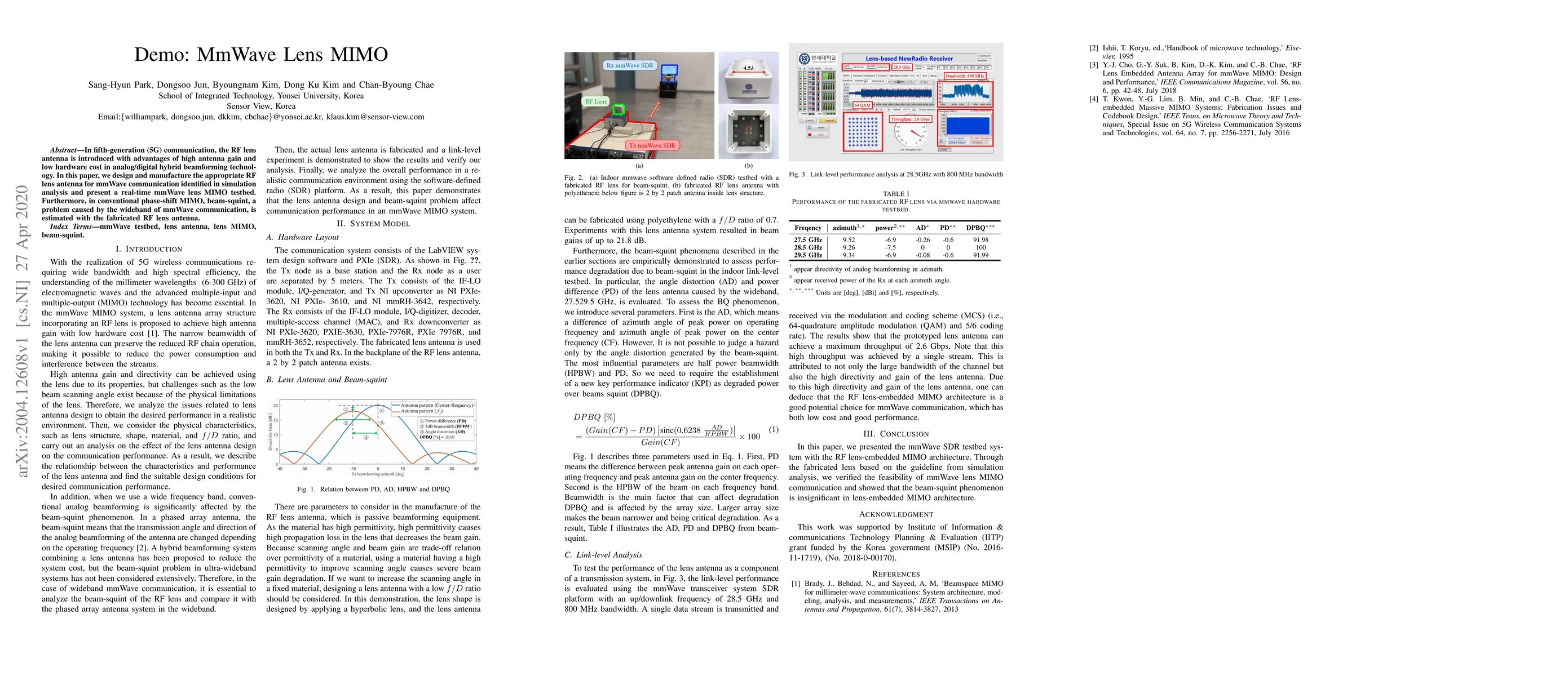 The research demonstrated the feasibility of mmWave lens MIMO communication and showed that the beam-squint phenomenon is insignificant in lens-embedded MIMO architecture.