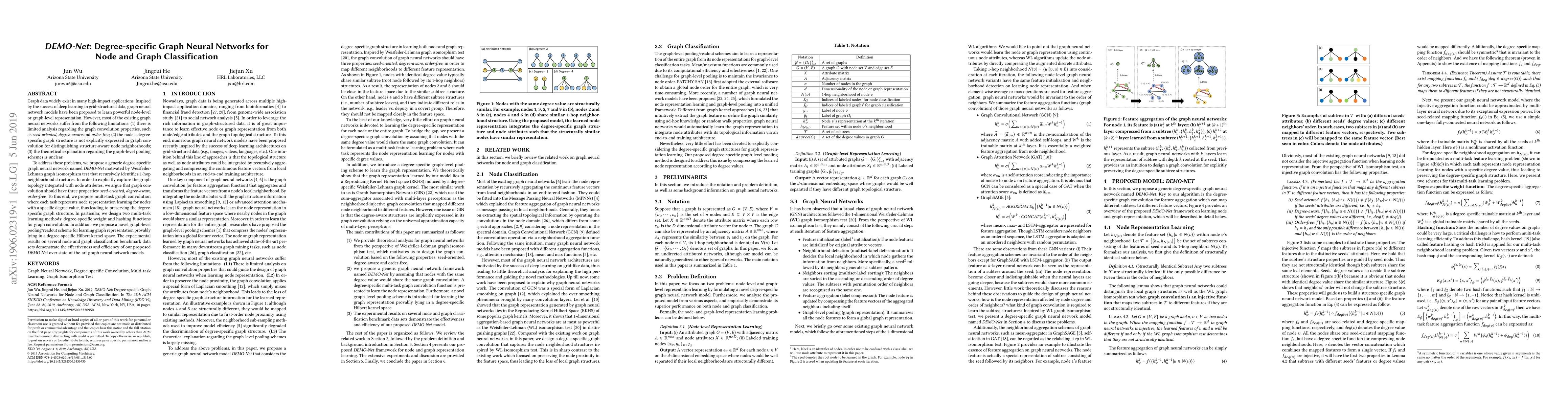 Graph data widely exist in many high-impact applications. Inspired by the success of deep learning in grid-structured data, graph neural network models have been proposed to learn powerful node-level or graph-level representation. However, most of the existing graph neural networks suffer from the following limitations: (1) there is limited analysis regarding the graph convolution properties, such as seed-oriented, degree-aware and order-free; (2) the node's degree-specific graph structure is not explicitly expressed in graph convolution for distinguishing structure-aware node neighborhoods; (3) the theoretical explanation regarding the graph-level pooling schemes is unclear. To address these problems, we propose a generic degree-specific graph neural network named DEMO-Net motivated by Weisfeiler-Lehman graph isomorphism test that recursively identifies 1-hop neighborhood structures. In order to explicitly capture the graph topology integrated with node attributes, we argue that graph convolution should have three properties: seed-oriented, degree-aware, order-free. To this end, we propose multi-task graph convolution where each task represents node representation learning for nodes with a specific degree value, thus leading to preserving the degree-specific graph structure. In particular, we design two multi-task learning methods: degree-specific weight and hashing functions for graph convolution. In addition, we propose a novel graph-level pooling/readout scheme for learning graph representation provably lying in a degree-specific Hilbert kernel space. The experimental results on several node and graph classification benchmark data sets demonstrate the effectiveness and efficiency of our proposed DEMO-Net over state-of-the-art graph neural network models.