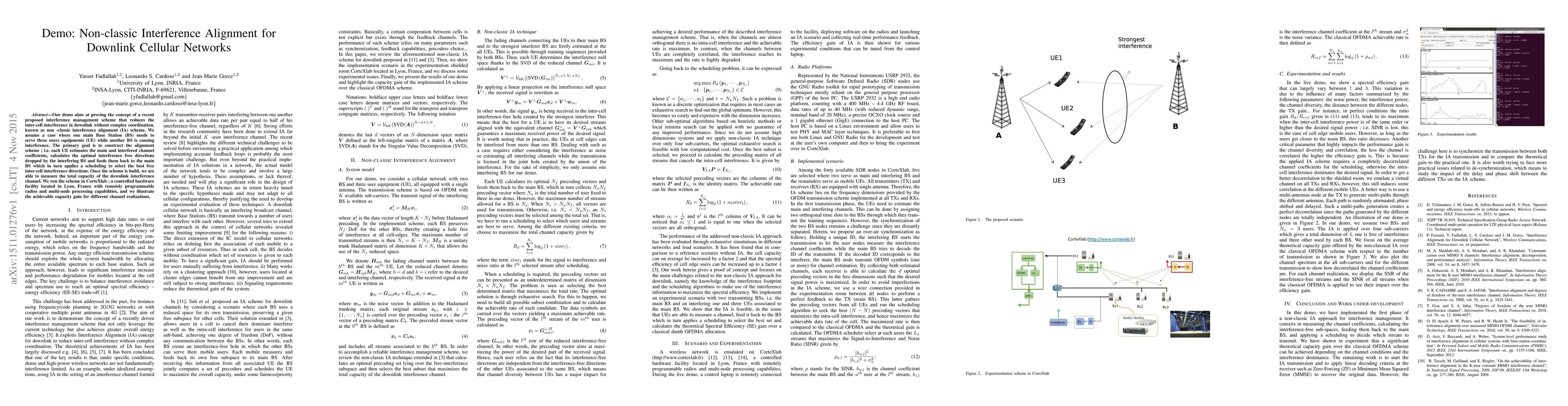 Our demo aims at proving the concept of a recent proposed interference management scheme that reduces the inter-cell interference in downlink without complex coordination, known as non-classic interference alignment (IA) scheme. We assume a case where one main Base Station (BS) needs to serve three users equipments (UE) while another BS is causing interference. The primary goal is to construct the alignment scheme ; i.e. each UE estimates the main and interfered channel coefficients, calculates the optimal interference free directions dropped by the interfering BS and feeds them back to the main BS which in turn applies a scheduling to select the best free inter-cell interference directions. Once the scheme is build, we are able to measure the total capacity of the downlink interference channel. We run the scheme in CorteXlab ; a controlled hardware facility located in Lyon, France with remotely programmable radios and multi-node processing capabilities, and we illustrate the achievable capacity gain for different channel realizations.