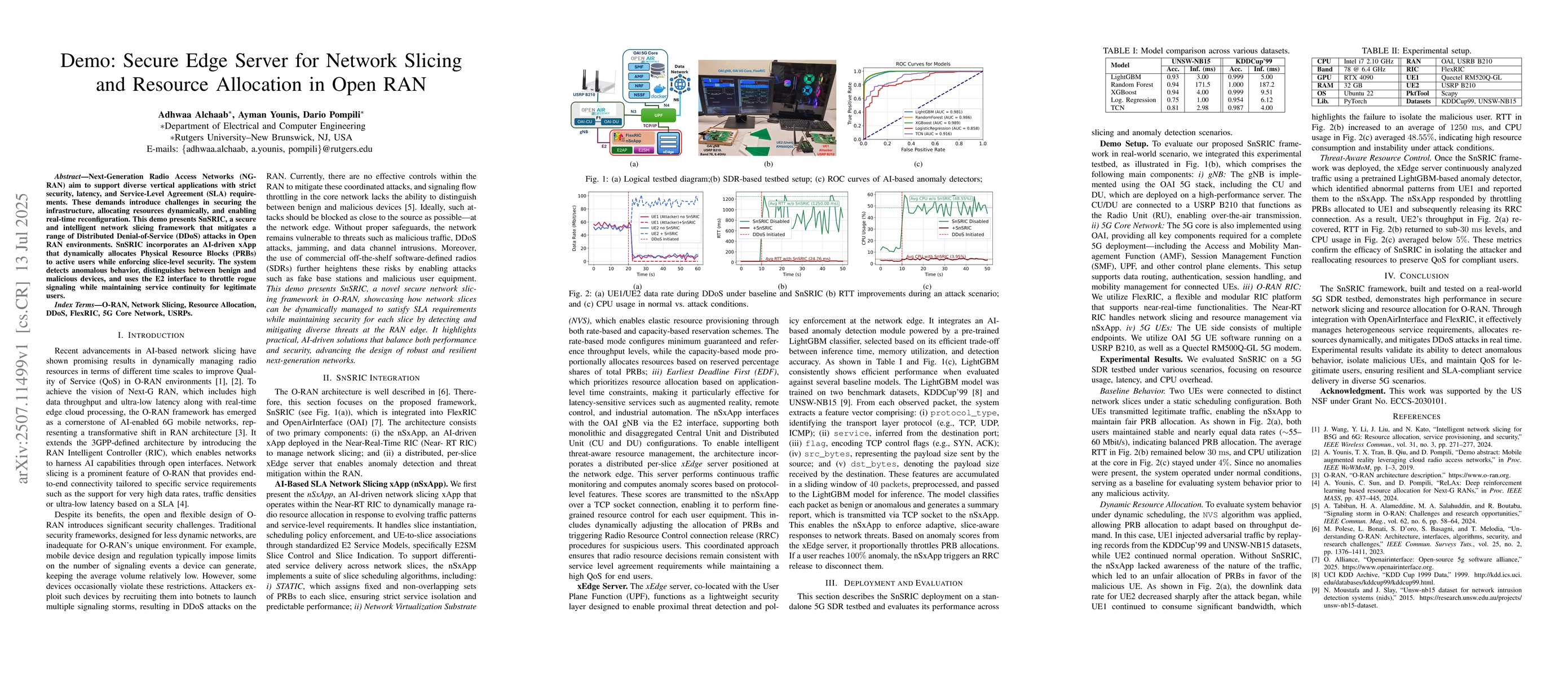 Next-Generation Radio Access Networks (NGRAN) aim to support diverse vertical applications with strict security, latency, and Service-Level Agreement (SLA) requirements. These demands introduce challenges in securing the infrastructure, allocating resources dynamically, and enabling real-time reconfiguration. This demo presents SnSRIC, a secure and intelligent network slicing framework that mitigates a range of Distributed Denial-of-Service (DDoS) attacks in Open RAN environments. SnSRIC incorporates an AI-driven xApp that dynamically allocates Physical Resource Blocks (PRBs) to active users while enforcing slice-level security. The system detects anomalous behavior, distinguishes between benign and malicious devices, and uses the E2 interface to throttle rogue signaling while maintaining service continuity for legitimate users.