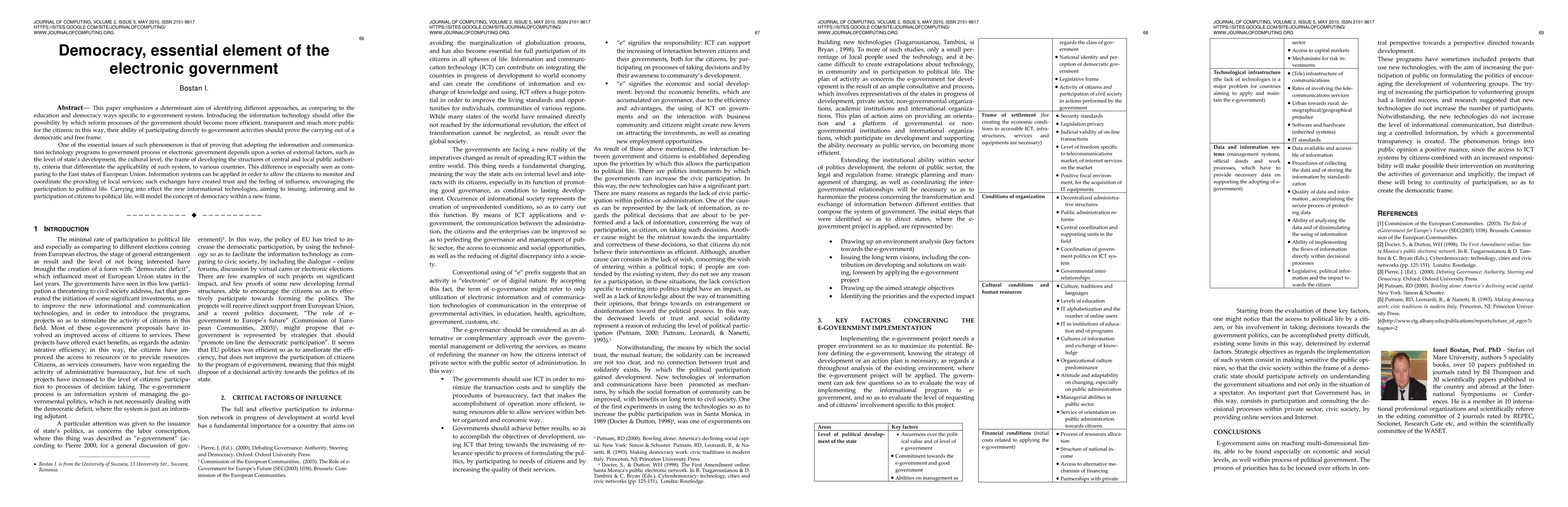 This paper explores how integrating information technology in e-government enhances democratic participation and transparency, while noting that the adoption of such systems depends on various external factors, including state development and cultural levels, with significant differences observed between Eastern and Western EU states. The implementation of these technologies fosters citizen engagement and trust in political processes.