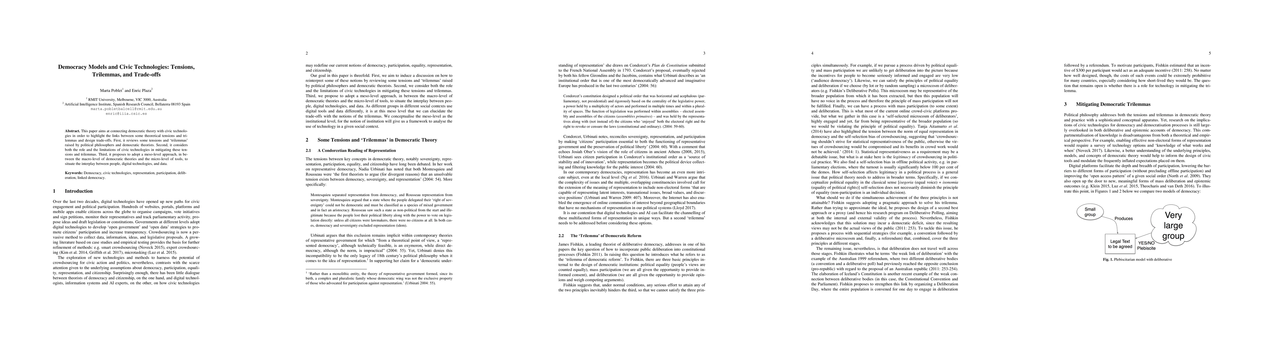 This paper explores the connection between democratic theory and civic technologies, highlighting tensions, trilemmas, and trade-offs in their interplay. It proposes a meso-level approach to understand the relationship between people, digital tools, and data in democratic systems.