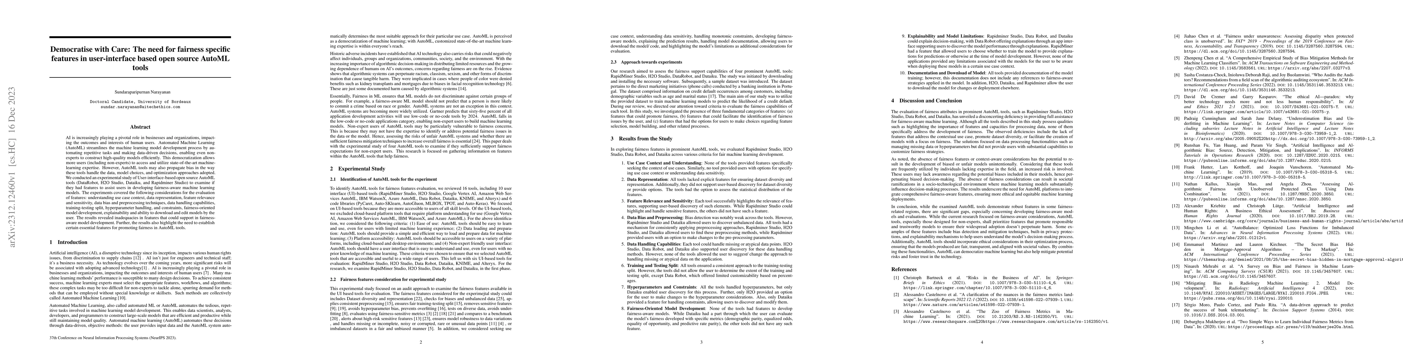 AI is increasingly playing a pivotal role in businesses and organizations, impacting the outcomes and interests of human users. Automated Machine Learning (AutoML) streamlines the machine learning model development process by automating repetitive tasks and making data-driven decisions, enabling even non-experts to construct high-quality models efficiently. This democratization allows more users (including non-experts) to access and utilize state-of-the-art machine-learning expertise. However, AutoML tools may also propagate bias in the way these tools handle the data, model choices, and optimization approaches adopted. We conducted an experimental study of User-interface-based open source AutoML tools (DataRobot, H2O Studio, Dataiku, and Rapidminer Studio) to examine if they had features to assist users in developing fairness-aware machine learning models. The experiments covered the following considerations for the evaluation of features: understanding use case context, data representation, feature relevance and sensitivity, data bias and preprocessing techniques, data handling capabilities, training-testing split, hyperparameter handling, and constraints, fairness-oriented model development, explainability and ability to download and edit models by the user. The results revealed inadequacies in features that could support in fairness-aware model development. Further, the results also highlight the need to establish certain essential features for promoting fairness in AutoML tools.