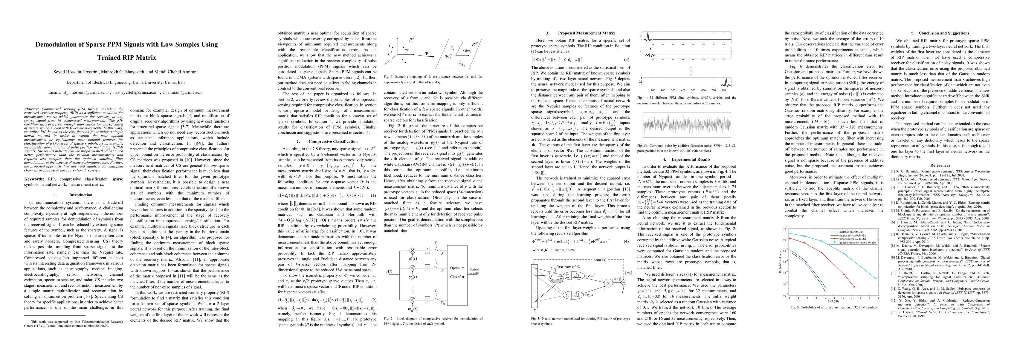 Compressed sensing (CS) theory considers the restricted isometry property (RIP) as a sufficient condition for measurement matrix which guarantees the recovery of any sparse signal from its compressed measurements. The RIP condition also preserves enough information for classification of sparse symbols, even with fewer measurements. In this work, we utilize RIP bound as the cost function for training a simple neural network in order to exploit the near optimal measurements or equivalently near optimal features for classification of a known set of sparse symbols. As an example, we consider demodulation of pulse position modulation (PPM) signals. The results indicate that the proposed method has much better performance than the random measurements and requires less samples than the optimum matched filter demodulator, at the expense of some performance loss. Further, the proposed approach does not need equalizer for multipath channels in contrast to the conventional receiver.