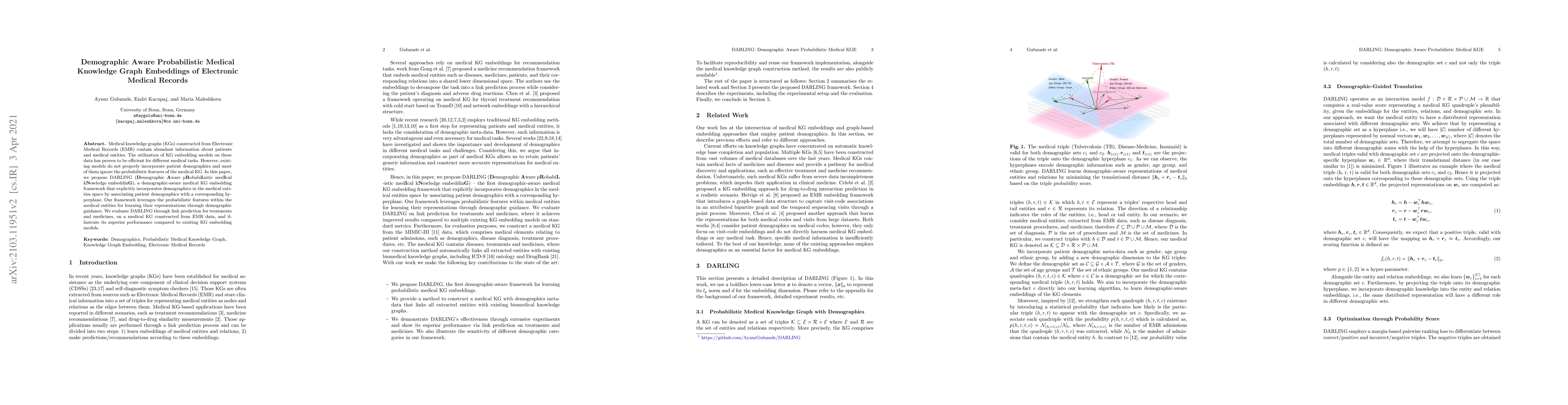 This paper introduces DARLING, a demographic-aware probabilistic medical knowledge graph embedding framework that integrates patient demographics and probabilistic features to enhance representation learning. The proposed model outperforms existing models in link prediction tasks for treatments and medicines.