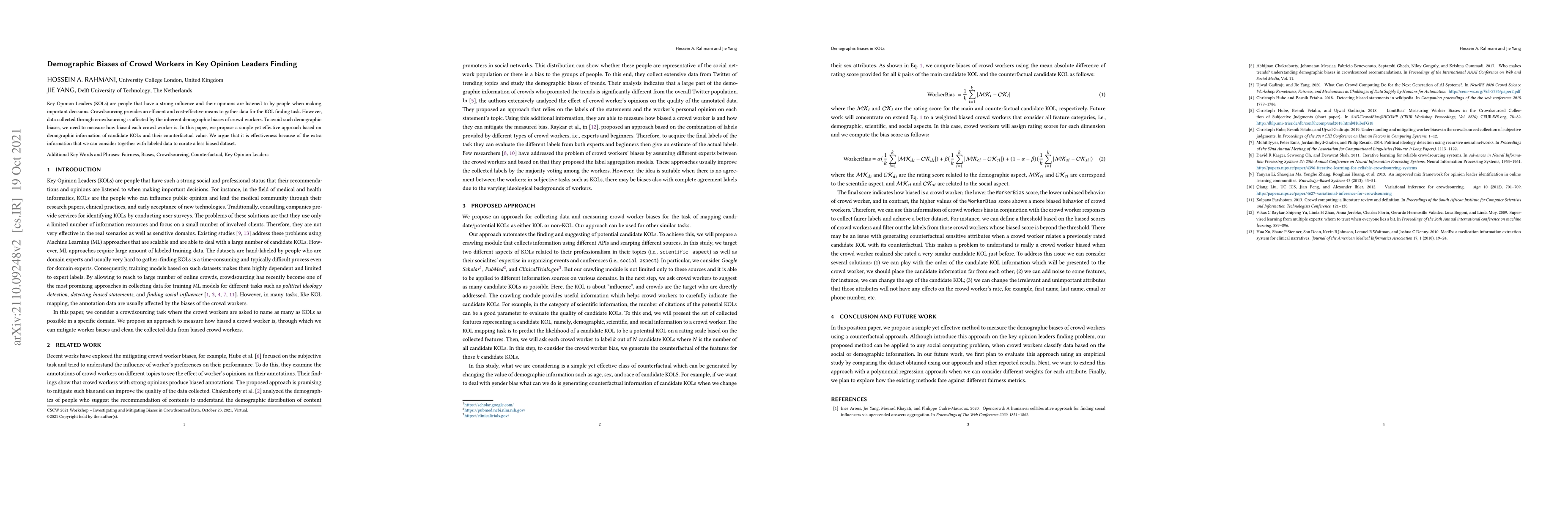 This paper proposes a method to mitigate demographic biases in crowd workers used for identifying Key Opinion Leaders (KOLs) by evaluating the bias of each worker based on demographic information and counterfactual values. The approach aims to curate a more unbiased dataset by incorporating additional information alongside labeled data.