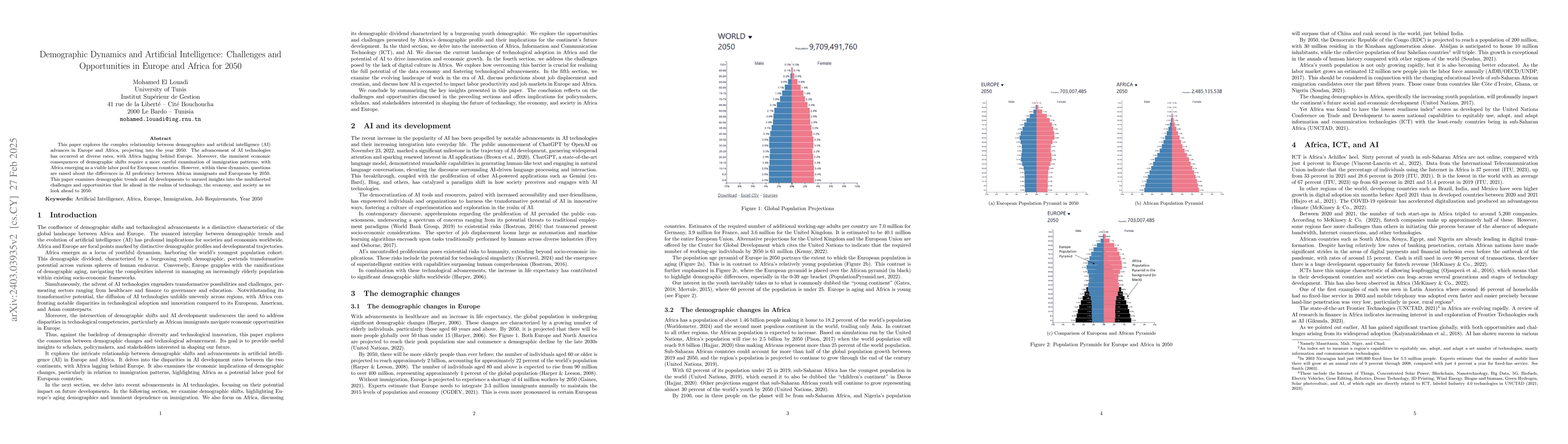 This paper investigates the interplay between demographic changes and artificial intelligence (AI) advancements in Europe and Africa, projecting to 2050, highlighting Africa's potential as a labor resource for Europe, and questioning AI proficiency disparities between African immigrants and Europeans. It explores the challenges and opportunities these dynamics present for technology, economy, and society.