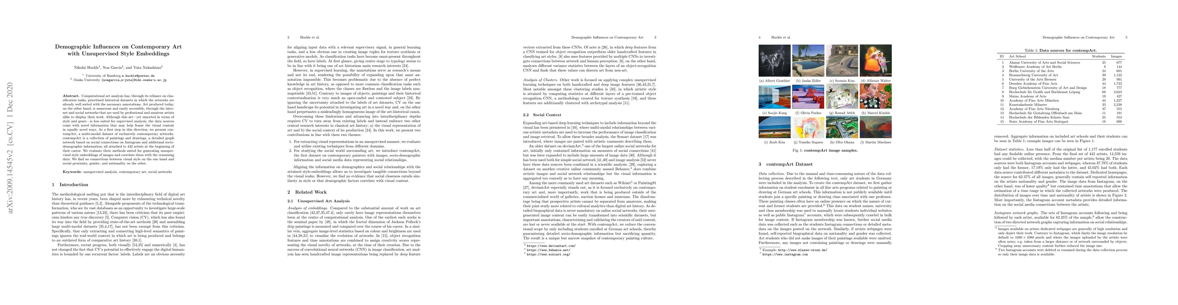 Computational art analysis has, through its reliance on classification tasks, prioritised historical datasets in which the artworks are already well sorted with the necessary annotations. Art produced today, on the other hand, is numerous and easily accessible, through the internet and social networks that are used by professional and amateur artists alike to display their work. Although this art, yet unsorted in terms of style and genre, is less suited for supervised analysis, the data sources come with novel information that may help frame the visual content in equally novel ways. As a first step in this direction, we present contempArt, a multi-modal dataset of exclusively contemporary artworks. contempArt is a collection of paintings and drawings, a detailed graph network based on social connections on Instagram and additional socio-demographic information; all attached to 442 artists at the beginning of their career. We evaluate three methods suited for generating unsupervised style embeddings of images and correlate them with the remaining data. We find no connections between visual style on the one hand and social proximity, gender, and nationality on the other.