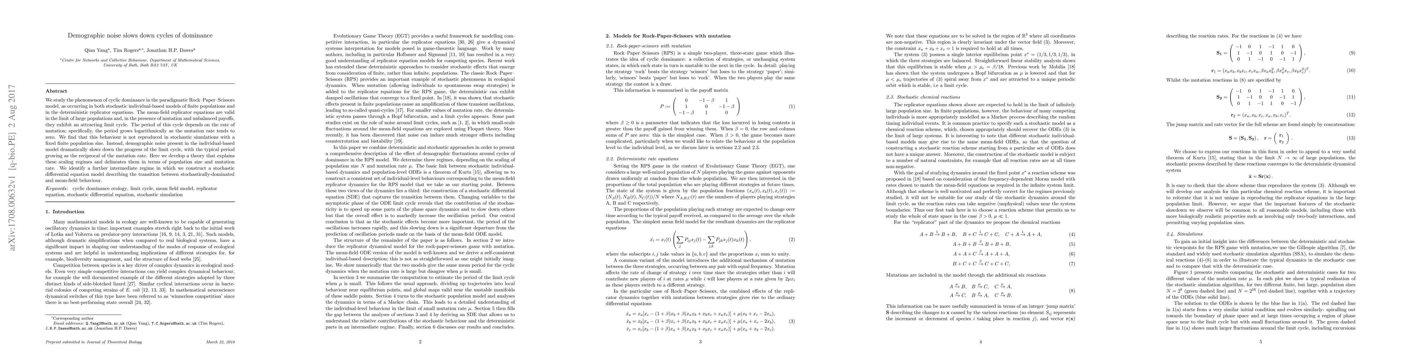 We study the phenomenon of cyclic dominance in the paradigmatic Rock--Paper--Scissors model, as occurring in both stochastic individual-based models of finite populations and in the deterministic replicator equations. The mean-field replicator equations are valid in the limit of large populations and, in the presence of mutation and unbalanced payoffs, they exhibit an attracting limit cycle. The period of this cycle depends on the rate of mutation; specifically, the period grows logarithmically as the mutation rate tends to zero. We find that this behaviour is not reproduced in stochastic simulations with a fixed finite population size. Instead, demographic noise present in the individual-based model dramatically slows down the progress of the limit cycle, with the typical period growing as the reciprocal of the mutation rate. Here we develop a theory that explains these scaling regimes and delineates them in terms of population size and mutation rate. We identify a further intermediate regime in which we construct a stochastic differential equation model describing the transition between stochastically-dominated and mean-field behaviour.