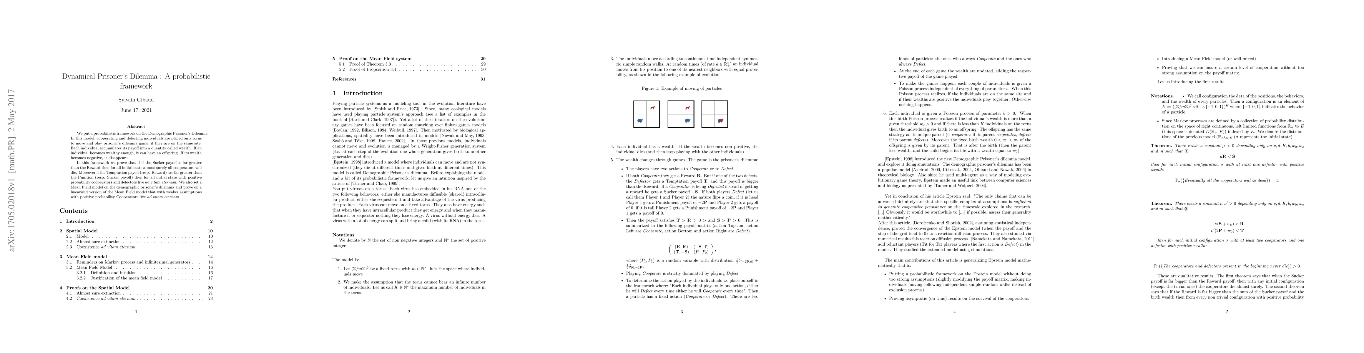 We put a probabilistic framework on the Demographic Prisoner's Dilemma. In this model, cooperating and defecting individuals are placed on a torus to move and play prisoner's dilemma game, if they are on the same site. Each individual accumulates its payoff into a quantity called wealth. If an individual becomes wealthy enough, it can have an offspring. If its wealth becomes negative, it disappears. In this framework we prove that if if the Sucker payoff is far greater than the Reward then for all initial state almost surely all cooperators will die. Moreover if the Temptation payoff (resp. Reward) are far greater than the Punition (resp. Sucker payoff) then for all initial state with positive probability cooperators and defectors live \emph{ad vitam eternam}. We also set a Mean Field model on the demographic prisoner's dilemma and prove on a linearized version of the Mean Field model that with weaker assumptions with positive probability Cooperators live \emph{ad vitam eternam}.