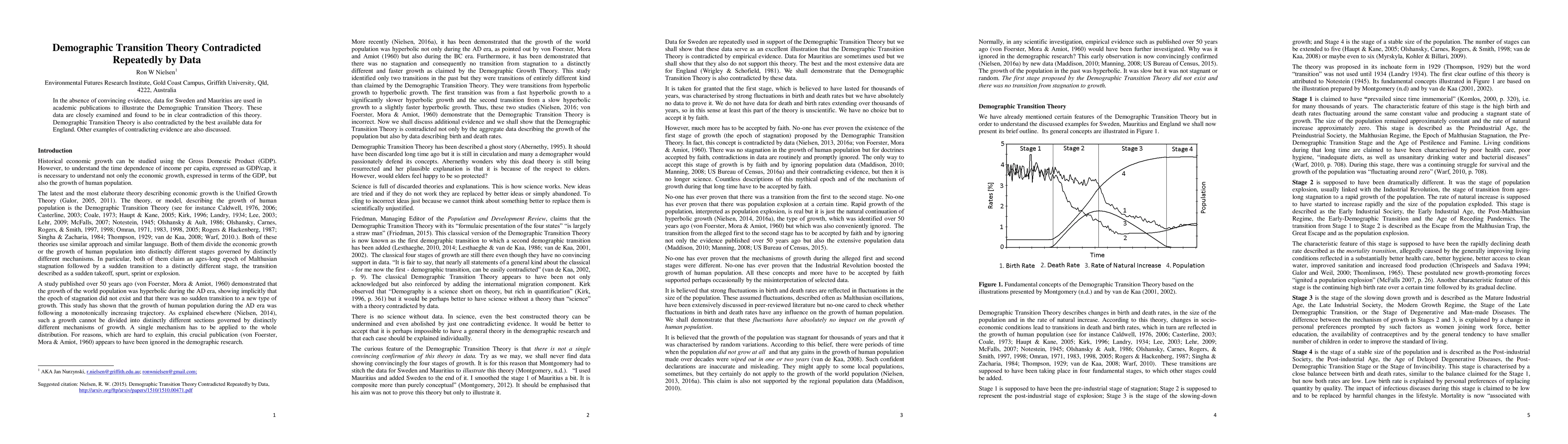 In the absence of convincing evidence, data for Sweden and Mauritius are used in academic publications to illustrate the Demographic Transition Theory. These data are closely examined and found to be in clear contradiction of this theory. Demographic Transition Theory is also contradicted by the best available data for England. Other examples of contradicting evidence are also discussed.