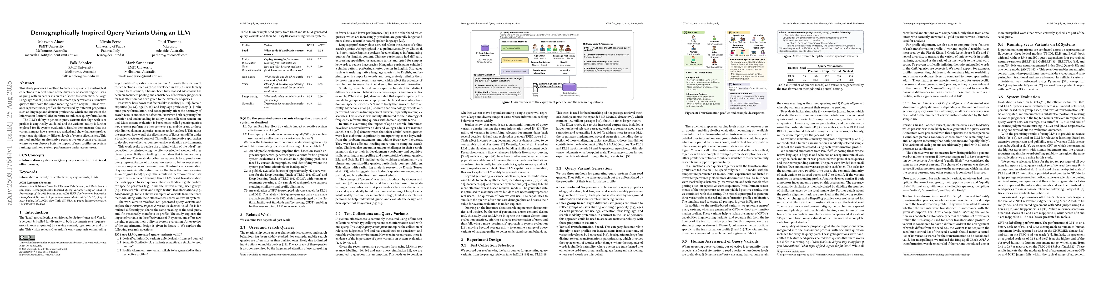 This study proposes a method to diversify queries in existing test collections to reflect some of the diversity of search engine users, aligning with an earlier vision of an 'ideal' test collection. A Large Language Model (LLM) is used to create query variants: alternative queries that have the same meaning as the original. These variants represent user profiles characterised by different properties, such as language and domain proficiency, which are known in the IR literature to influence query formulation. The LLM's ability to generate query variants that align with user profiles is empirically validated, and the variants' utility is further explored for IR system evaluation. Results demonstrate that the variants impact how systems are ranked and show that user profiles experience significantly different levels of system effectiveness. This method enables an alternative perspective on system evaluation where we can observe both the impact of user profiles on system rankings and how system performance varies across users.