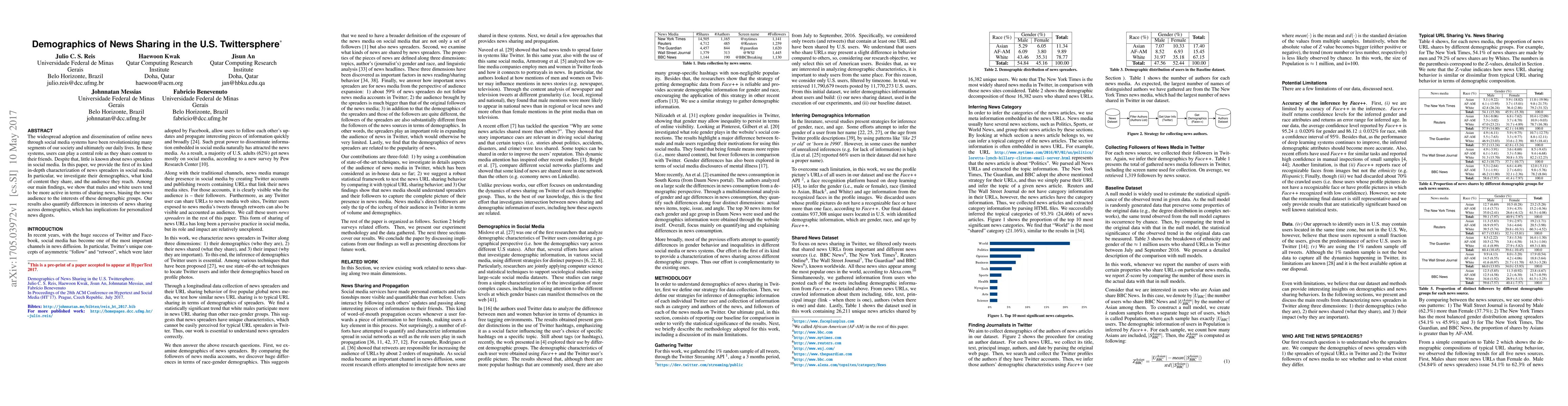 The widespread adoption and dissemination of online news through social media systems have been revolutionizing many segments of our society and ultimately our daily lives. In these systems, users can play a central role as they share content to their friends. Despite that, little is known about news spreaders in social media. In this paper, we provide the first of its kind in-depth characterization of news spreaders in social media. In particular, we investigate their demographics, what kind of content they share, and the audience they reach. Among our main findings, we show that males and white users tend to be more active in terms of sharing news, biasing the news audience to the interests of these demographic groups. Our results also quantify differences in interests of news sharing across demographics, which has implications for personalized news digests.