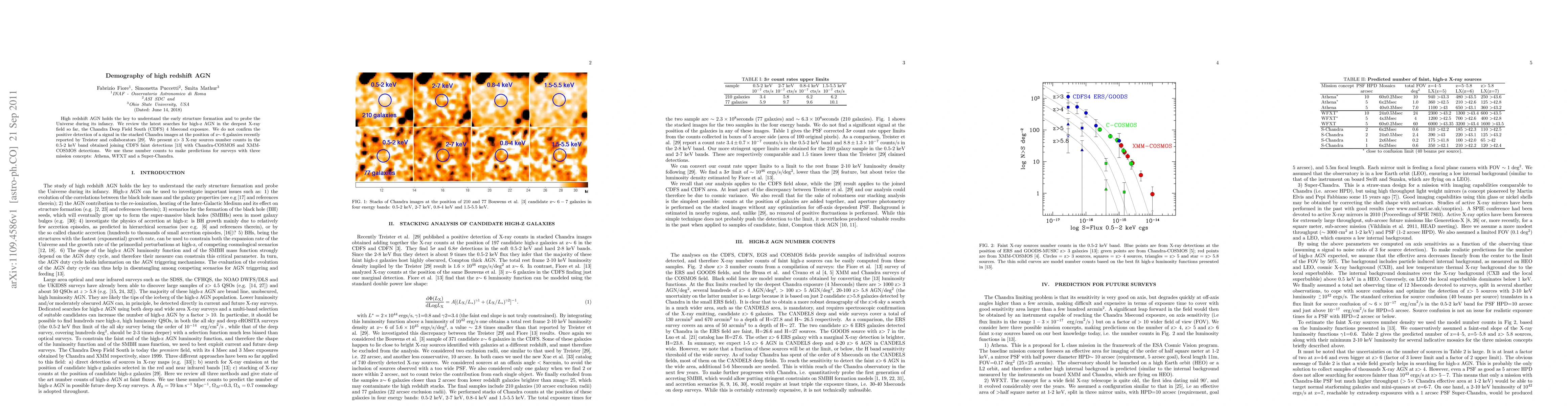 High redshift AGN holds the key to understand the early structure formation and to probe the Universe during its infancy. We review the latest searches for high-z AGN in the deepest X-ray field so far, the Chandra Deep Field South (CDFS) 4 Msecond exposure. We do not confirm the positive detection of a signal in the stacked Chandra images at the position of z~6 galaxies recently reported by Treister and collaborators. We present z>3 X-ray sources number counts in the 0.5-2 keV band obtained joining CDFS faint detections with Chandra-COSMOS and XMM-COSMOS detections. We use these number counts to make predictions for surveys with three mission concepts: Athena, WFXT and a Super-Chandra.