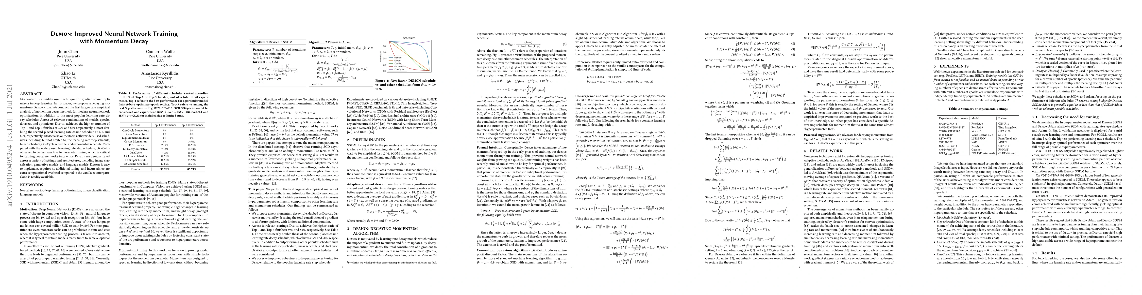 A new neural network training method called Demon outperforms existing learning rate decay schedules in image classification, generative models, and language models, with a 39% Top-1 finish rate.