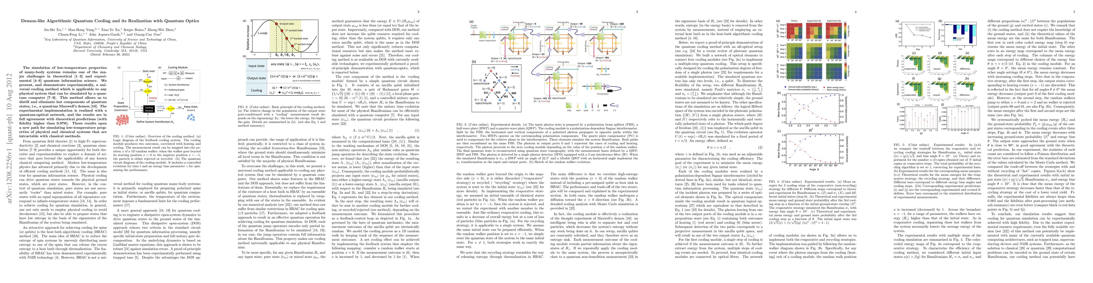 This paper introduces a universal quantum cooling method, akin to a quantum Maxwell's demon, for simulating low-temperature properties of many-body systems. Experimentally demonstrated using quantum optics, the method achieves high fidelity, paving the way for advanced simulations of complex physical and chemical systems.