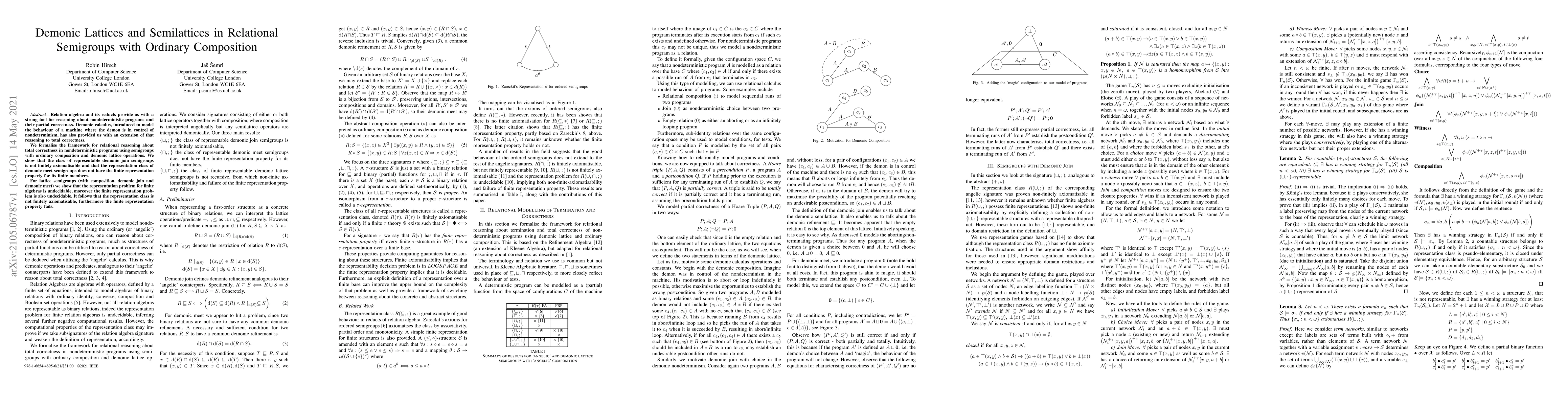 Relation algebra and its reducts provide us with a strong tool for reasoning about nondeterministic programs and their partial correctness. Demonic calculus, introduced to model the behaviour of a machine where the demon is in control of nondeterminism, has also provided us with an extension of that reasoning to total correctness. We formalise the framework for relational reasoning about total correctness in nondeterministic programs using semigroups with ordinary composition and demonic lattice operations. We show that the class of representable demonic join semigroups is not finitely axiomatisable and that the representation class of demonic meet semigroups does not have the finite representation property for its finite members. For lattice semigroups (with composition, demonic join and demonic meet) we show that the representation problem for finite algebras is undecidable, moreover the finite representation problem is also undecidable. It follows that the representation class is not finitely axiomatisable, furthermore the finite representation property fails.