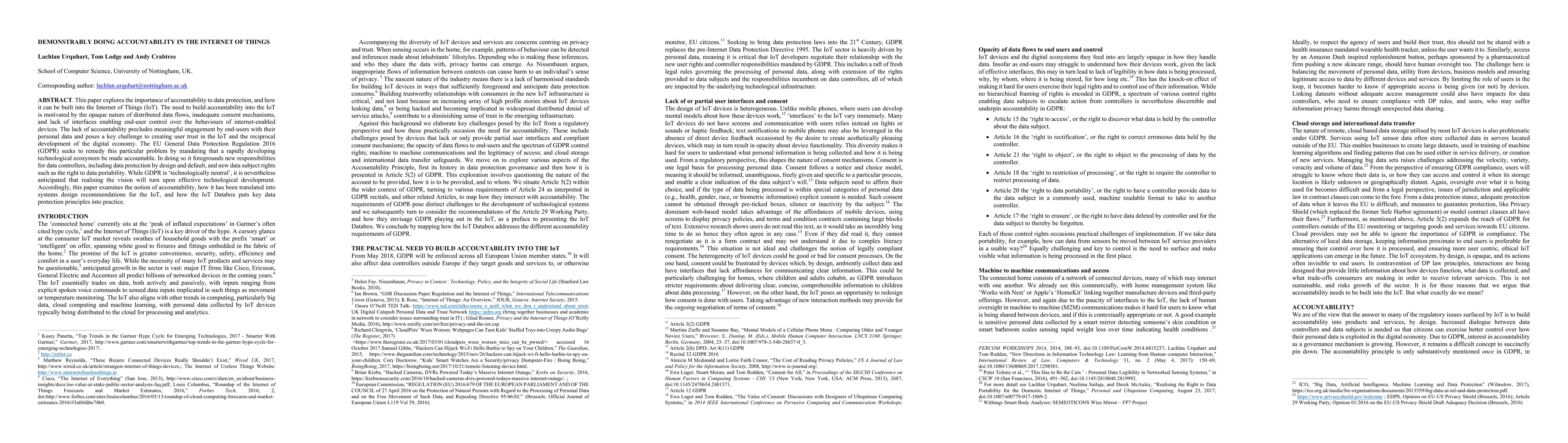 This paper investigates the integration of accountability into the Internet of Things (IoT) to ensure data protection, addressing the challenges posed by opaque data flows and inadequate user consent mechanisms. It highlights the EU GDPR's role in mandating accountability and examines the IoT Databox as a practical implementation of these principles.