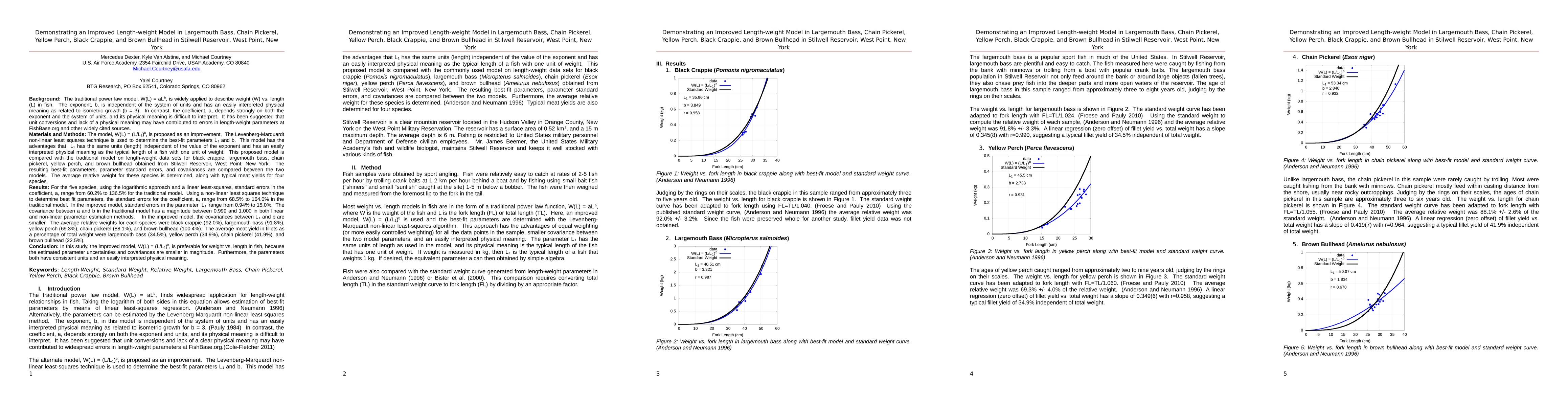 The traditional power law model, W(L) = aL^b, is widely applied to describe weight (W) vs. length (L) in fish. The model, W(L) = (L/L1)^b, is proposed as an improvement. The Levenberg-Marquardt non-linear least squares technique is used to determine the best-fit parameters L1 and b. This model has the advantages that L1 has the same units (length) independent of the value of the exponent and has an easily interpreted physical meaning as the typical length of a fish with one unit of weight. This proposed model is compared with the traditional model on length-weight data sets for black crappie, largemouth bass, chain pickerel, yellow perch, and brown bullhead obtained from Stilwell Reservoir, West Point, New York. The resulting best-fit parameters, parameter standard errors, and covariances are compared between the two models. The average relative weight for these species is determined, along with typical meat yields for four species. For the five species, using the logarithmic approach and a linear least-squares, standard errors in the coefficient, a, range from 60.2% to 136.5% for the traditional model. Using a non-linear least squares technique to determine best fit parameters, the standard errors for the coefficient, a, range from 68.5% to 164.0% in the traditional model. In the improved model, standard errors in the parameter L1 range from 0.94% to 15.0%. The covariance between a and b in the traditional model has a magnitude between 0.999 and 1.000 in both linear and non-linear parameter estimation methods. In the improved model, the covariances between L1 and b are smaller. The improved model, W(L) = (L/L1)^b, is preferable for weight vs. length in fish, because the estimated parameter uncertainties and covariances are smaller in magnitude. Furthermore, the parameters both have consistent units and an easily interpreted physical meaning.