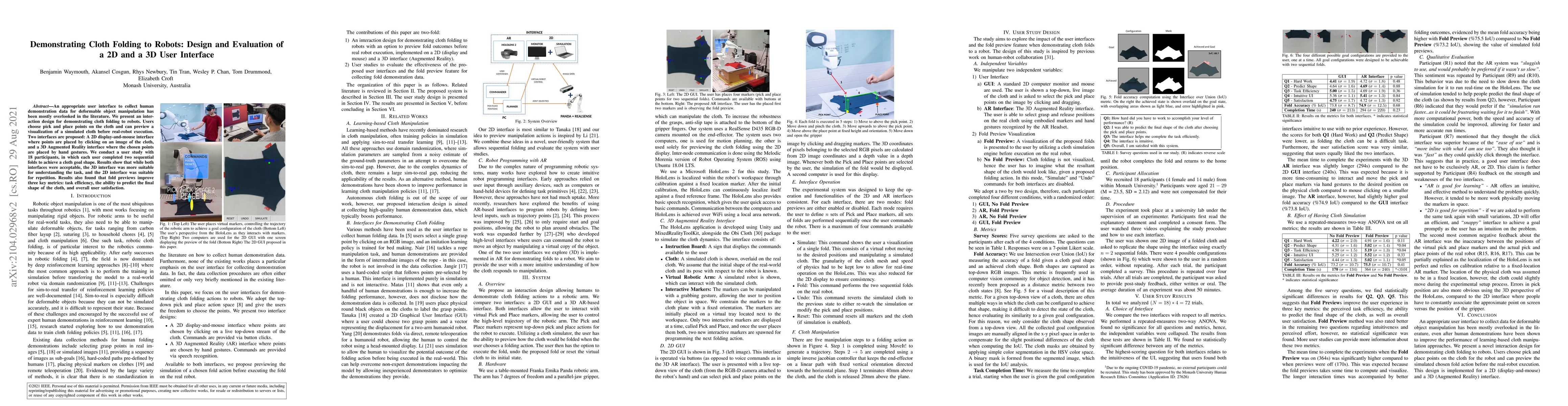An appropriate user interface to collect human demonstration data for deformable object manipulation has been mostly overlooked in the literature. We present an interaction design for demonstrating cloth folding to robots. Users choose pick and place points on the cloth and can preview a visualization of a simulated cloth before real-robot execution. Two interfaces are proposed: A 2D display-and-mouse interface where points are placed by clicking on an image of the cloth, and a 3D Augmented Reality interface where the chosen points are placed by hand gestures. We conduct a user study with 18 participants, in which each user completed two sequential folds to achieve a cloth goal shape. Results show that while both interfaces were acceptable, the 3D interface was found to be more suitable for understanding the task, and the 2D interface suitable for repetition. Results also found that fold previews improve three key metrics: task efficiency, the ability to predict the final shape of the cloth and overall user satisfaction.