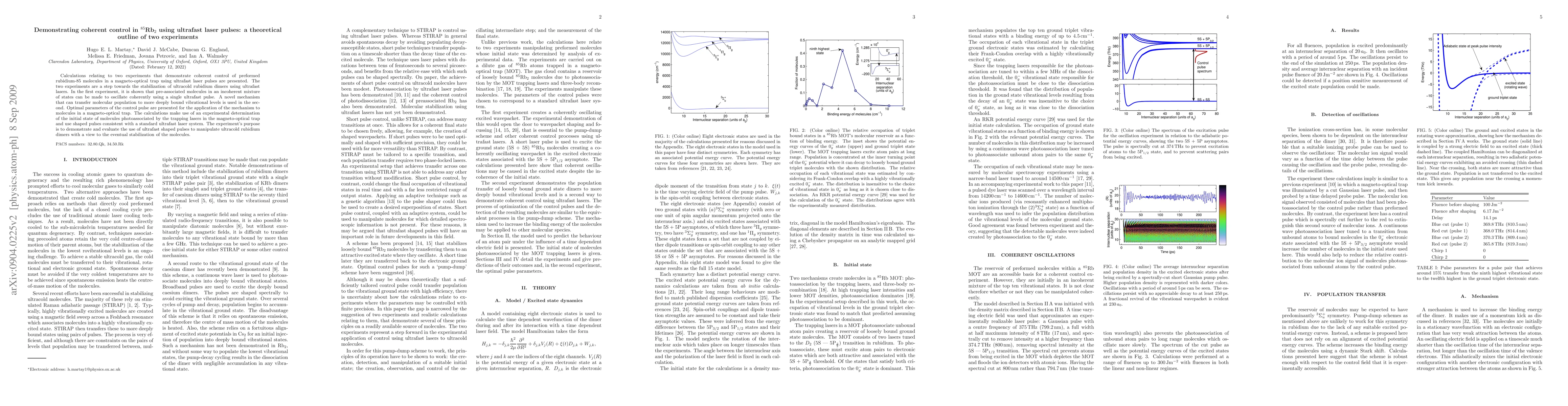 This paper outlines two experiments demonstrating coherent control of rubidium-85 molecules using ultrafast laser pulses. The first experiment shows how incoherent molecules can be made to oscillate coherently with a single ultrafast pulse, while the second explores a mechanism to transfer molecular population to deeper vibrational levels, with optimal parameters determined for a magneto-optical trap.