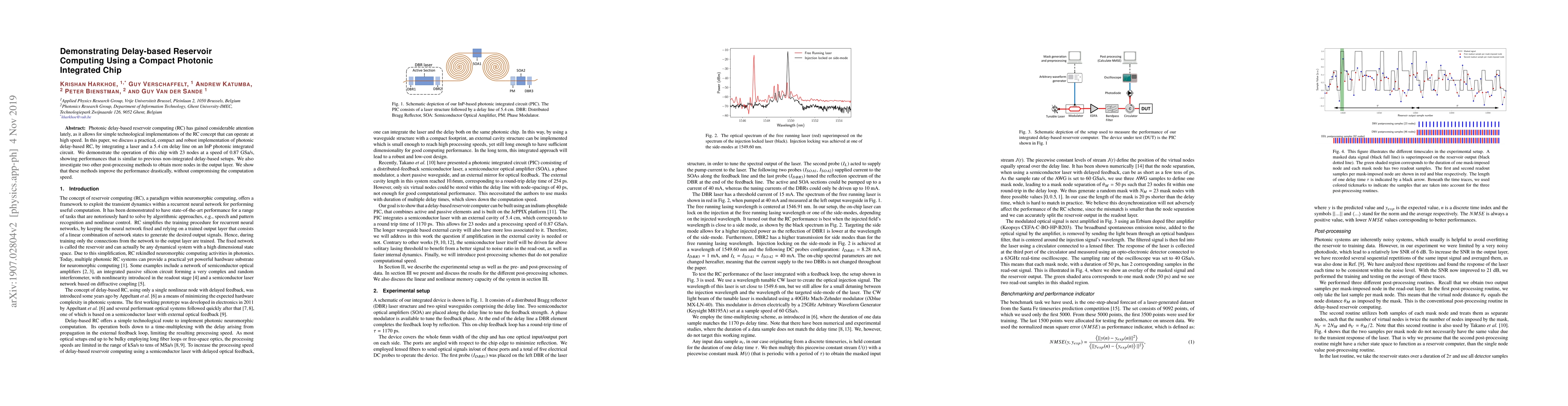 This paper presents a compact photonic integrated chip for delay-based reservoir computing, integrating a laser and a 5.4cm delay line on an InP platform. The chip operates at 0.87 GSa/s with 23 nodes, achieving performance comparable to non-integrated systems, and explores post-processing methods to enhance output node performance without sacrificing speed.