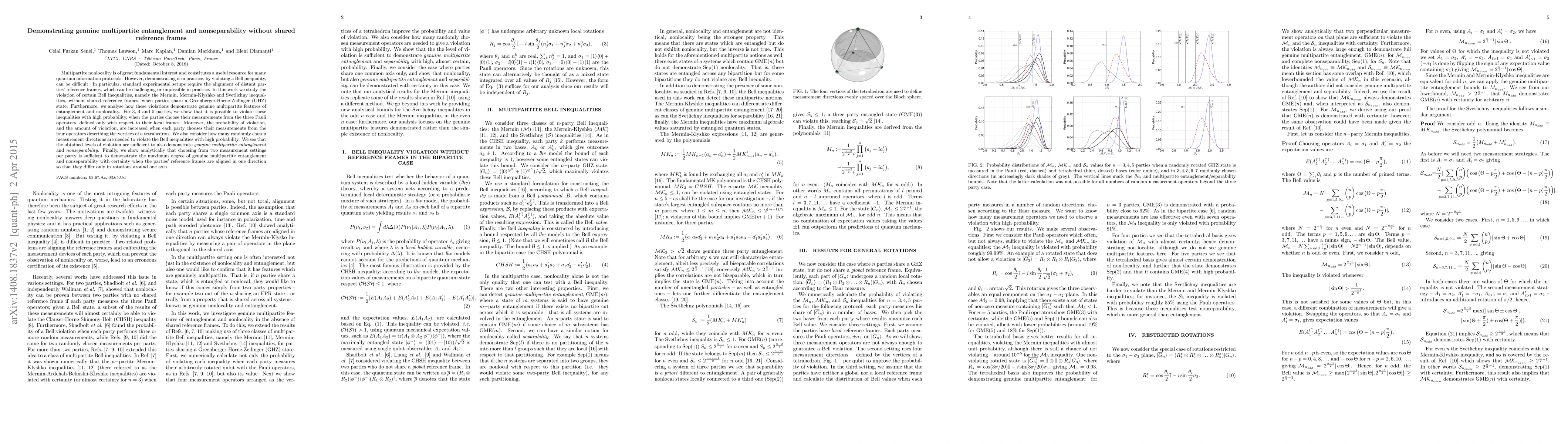 This paper demonstrates the violation of Mermin, Mermin-Klyshko, and Svetlichny inequalities without shared reference frames, showing genuine multipartite entanglement and nonseparability using GHZ states. The study reveals that high-probability violations can occur with measurements from local frames, and optimal violations are achieved with measurements from tetrahedron vertices.