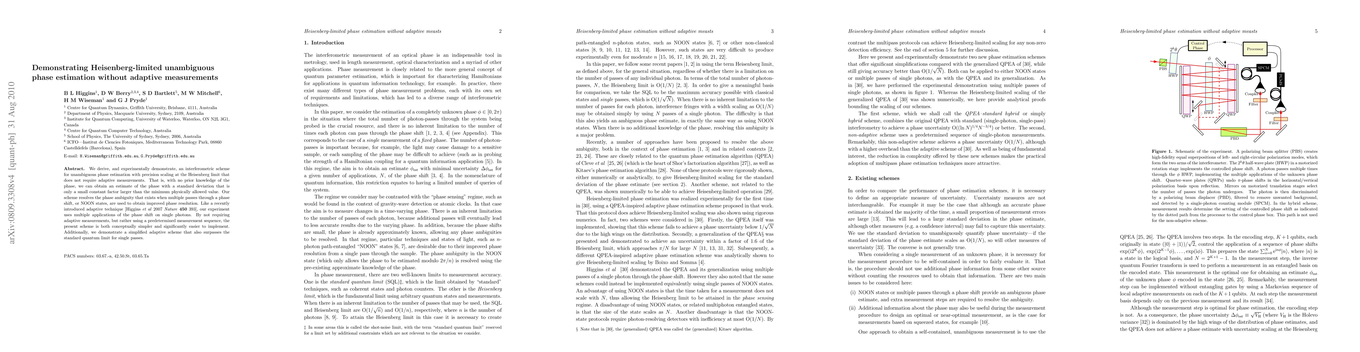 We derive, and experimentally demonstrate, an interferometric scheme for unambiguous phase estimation with precision scaling at the Heisenberg limit that does not require adaptive measurements. That is, with no prior knowledge of the phase, we can obtain an estimate of the phase with a standard deviation that is only a small constant factor larger than the minimum physically allowed value. Our scheme resolves the phase ambiguity that exists when multiple passes through a phase shift, or NOON states, are used to obtain improved phase resolution. Like a recently introduced adaptive technique [Higgins et al 2007 Nature 450 393], our experiment uses multiple applications of the phase shift on single photons. By not requiring adaptive measurements, but rather using a predetermined measurement sequence, the present scheme is both conceptually simpler and significantly easier to implement. Additionally, we demonstrate a simplified adaptive scheme that also surpasses the standard quantum limit for single passes.