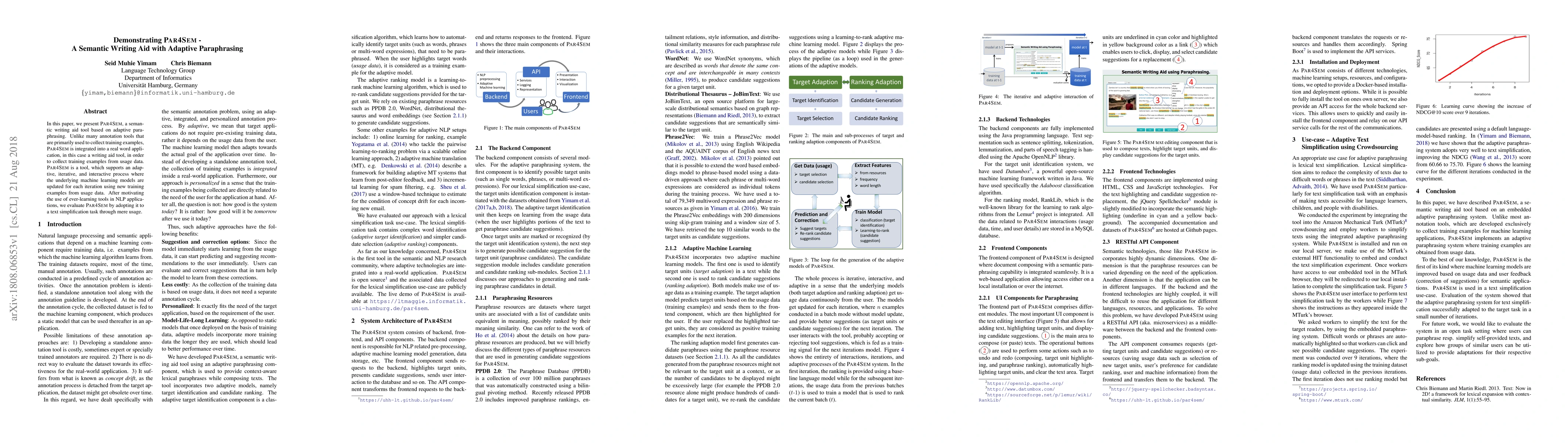 This paper introduces Par4Sem, a semantic writing aid that employs adaptive paraphrasing to collect training examples from usage data. The tool supports iterative learning, updating machine learning models with new examples, and is evaluated through its application in text simplification.