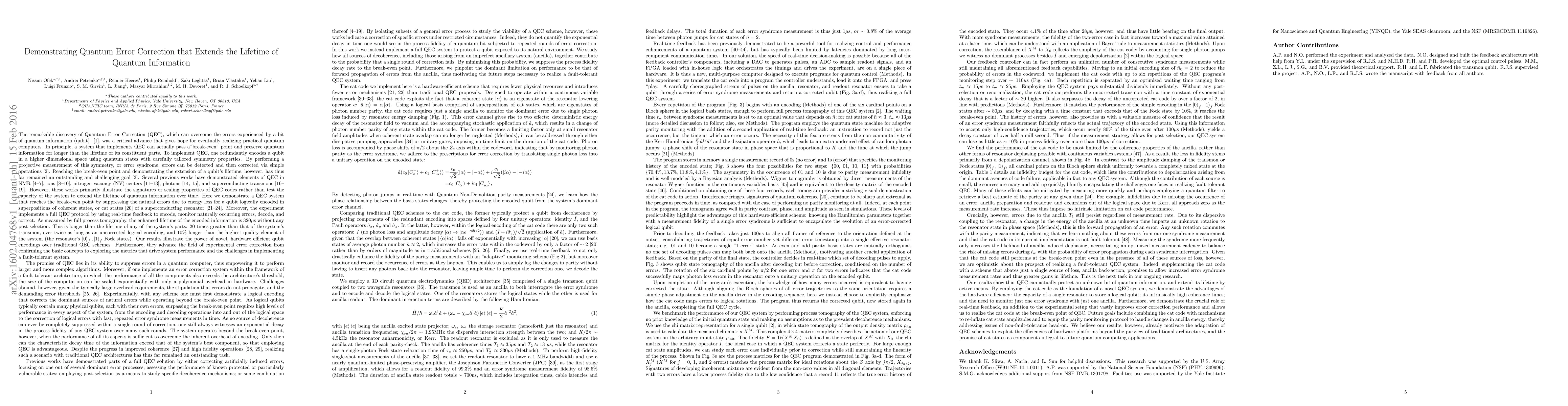 The remarkable discovery of Quantum Error Correction (QEC), which can overcome the errors experienced by a bit of quantum information (qubit), was a critical advance that gives hope for eventually realizing practical quantum computers. In principle, a system that implements QEC can actually pass a "break-even" point and preserve quantum information for longer than the lifetime of its constituent parts. Reaching the break-even point, however, has thus far remained an outstanding and challenging goal. Several previous works have demonstrated elements of QEC in NMR, ions, nitrogen vacancy (NV) centers, photons, and superconducting transmons. However, these works primarily illustrate the signatures or scaling properties of QEC codes rather than test the capacity of the system to extend the lifetime of quantum information over time. Here we demonstrate a QEC system that reaches the break-even point by suppressing the natural errors due to energy loss for a qubit logically encoded in superpositions of coherent states, or cat states of a superconducting resonator. Moreover, the experiment implements a full QEC protocol by using real-time feedback to encode, monitor naturally occurring errors, decode, and correct. As measured by full process tomography, the enhanced lifetime of the encoded information is 320 microseconds without any post-selection. This is 20 times greater than that of the system's transmon, over twice as long as an uncorrected logical encoding, and 10% longer than the highest quality element of the system (the resonator's 0, 1 Fock states). Our results illustrate the power of novel, hardware efficient qubit encodings over traditional QEC schemes. Furthermore, they advance the field of experimental error correction from confirming the basic concepts to exploring the metrics that drive system performance and the challenges in implementing a fault-tolerant system.