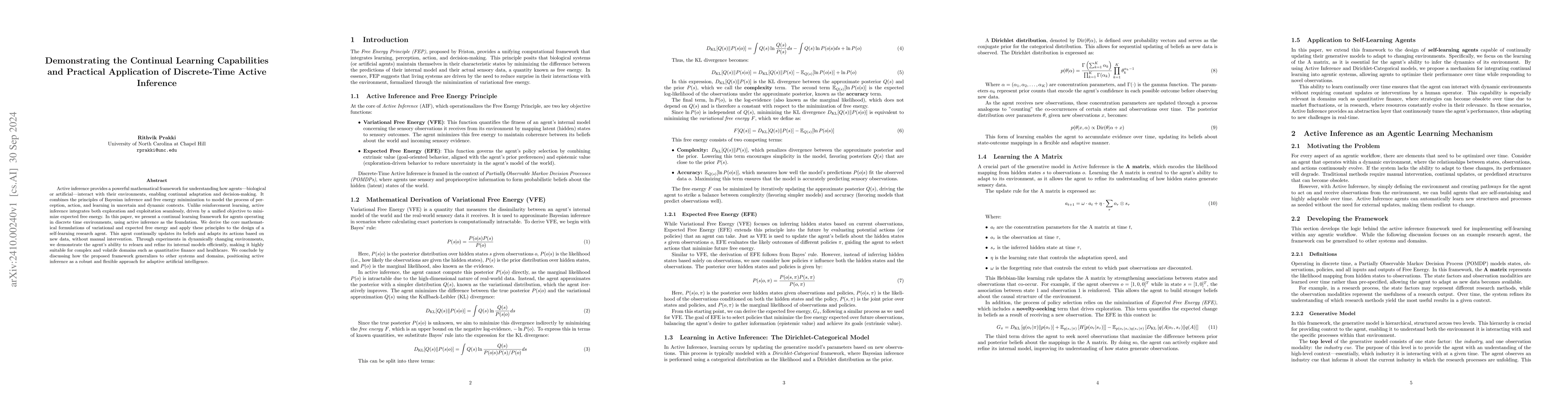 Active inference is a mathematical framework for understanding how agents (biological or artificial) interact with their environments, enabling continual adaptation and decision-making. It combines Bayesian inference and free energy minimization to model perception, action, and learning in uncertain and dynamic contexts. Unlike reinforcement learning, active inference integrates exploration and exploitation seamlessly by minimizing expected free energy. In this paper, we present a continual learning framework for agents operating in discrete time environments, using active inference as the foundation. We derive the mathematical formulations of variational and expected free energy and apply them to the design of a self-learning research agent. This agent updates its beliefs and adapts its actions based on new data without manual intervention. Through experiments in changing environments, we demonstrate the agent's ability to relearn and refine its models efficiently, making it suitable for complex domains like finance and healthcare. The paper concludes by discussing how the proposed framework generalizes to other systems, positioning active inference as a flexible approach for adaptive AI.