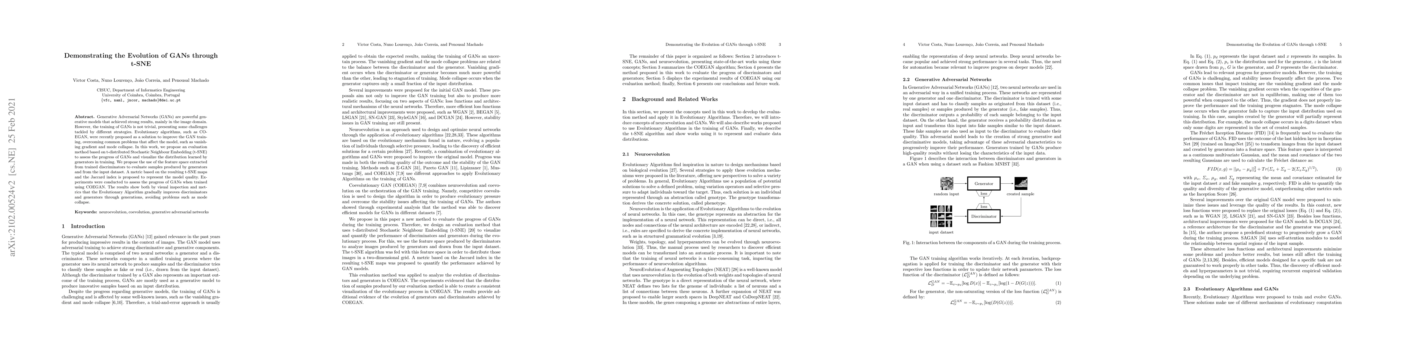 This paper proposes an evaluation method using t-SNE to visualize and assess the training progress of GANs, particularly when employing COEGAN to address issues like vanishing gradients and mode collapse. The study demonstrates that the evolutionary approach enhances both discriminator and generator performance over generations.