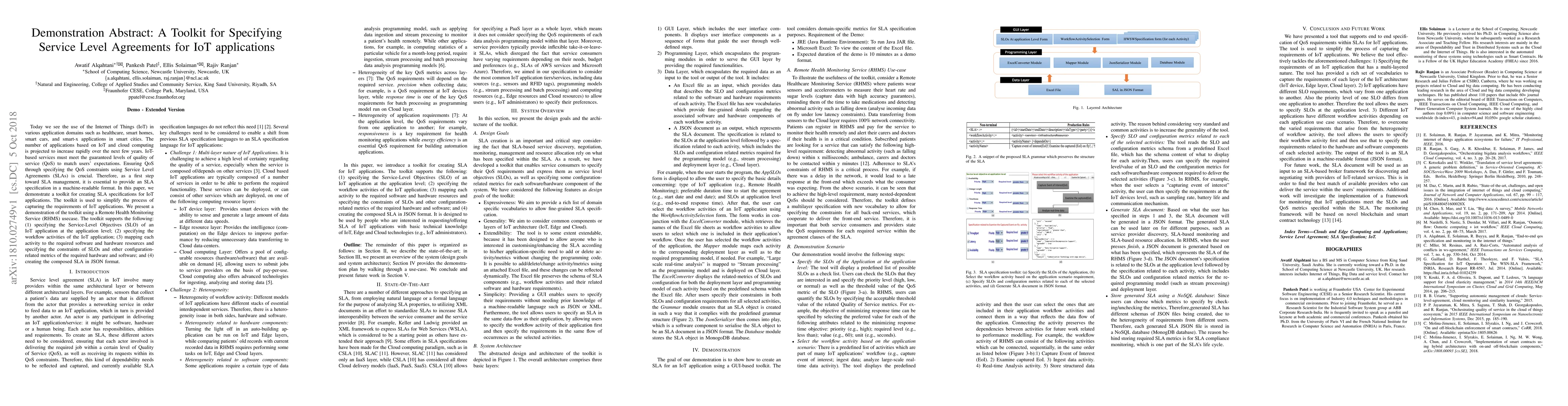 Today we see the use of the Internet of Things (IoT) in various application domains such as healthcare, smart homes, smart cars, and smart-x applications in smart cities. The number of applications based on IoT and cloud computing is projected to increase rapidly over the next few years. IoT-based services must meet the guaranteed levels of quality of service (QoS) to match users' expectations. Ensuring QoS through specifying the QoS constraints using Service Level Agreements (SLAs) is crucial. Therefore, as a first step toward SLA management, it is essential to provide an SLA specification in a machine-readable format. In this paper, we demonstrate a toolkit for creating SLA specifications for IoT applications. The toolkit is used to simplify the process of capturing the requirements of IoT applications. We present a demonstration of the toolkit using a Remote Health Monitoring Service (RHMS) usecase. The toolkit supports the following: (1) specifying the Service-Level Objectives (SLO) of an IoT application at the application level; (2) specifying the workflow activities of the IoT application; (3) mapping each activity to the required software and hardware resources and specifying the constraints of SLOs and other configuration- related metrics of the required hardware and software; and (4) creating the composed SLA in JSON format.