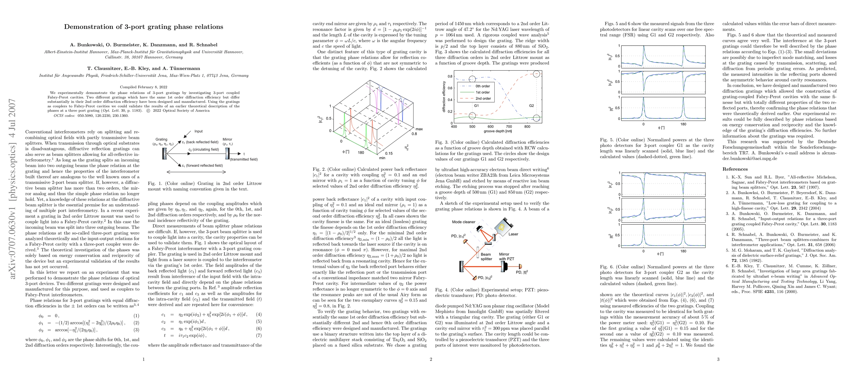 This paper demonstrates experimentally the phase relations of 3-port gratings through 3-port coupled Fabry-Perot cavities, validating theoretical predictions using two specially designed gratings with differing 2nd order diffraction efficiencies.