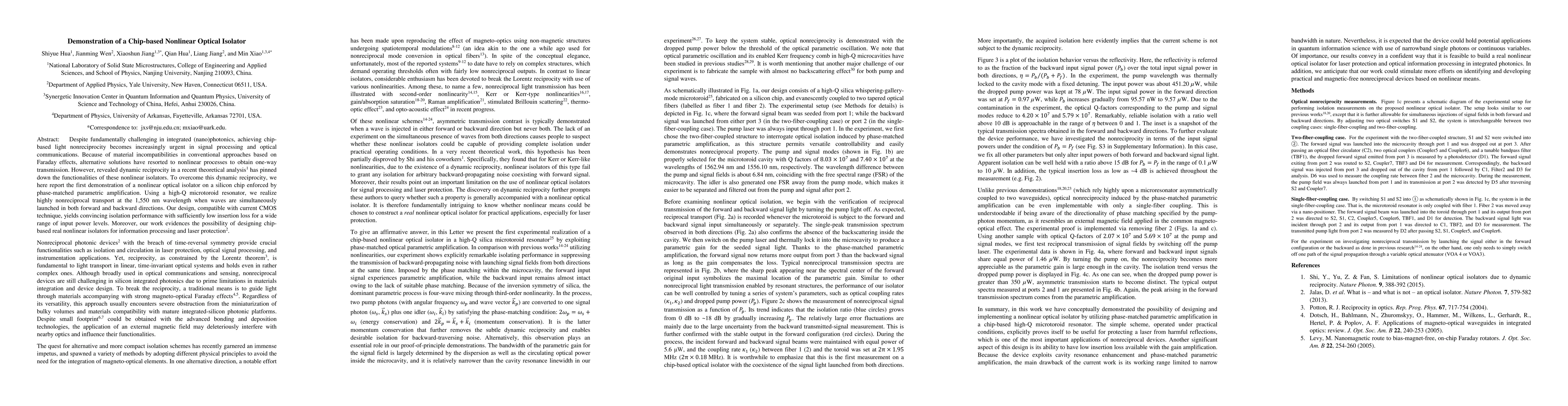 This paper demonstrates the first chip-based nonlinear optical isolator using phase-matched parametric amplification in a high-Q microtoroid resonator, achieving nonreciprocal transport at 1,550 nm. The design shows promising isolation performance compatible with CMOS technology, paving the way for applications in optical communications and signal processing.