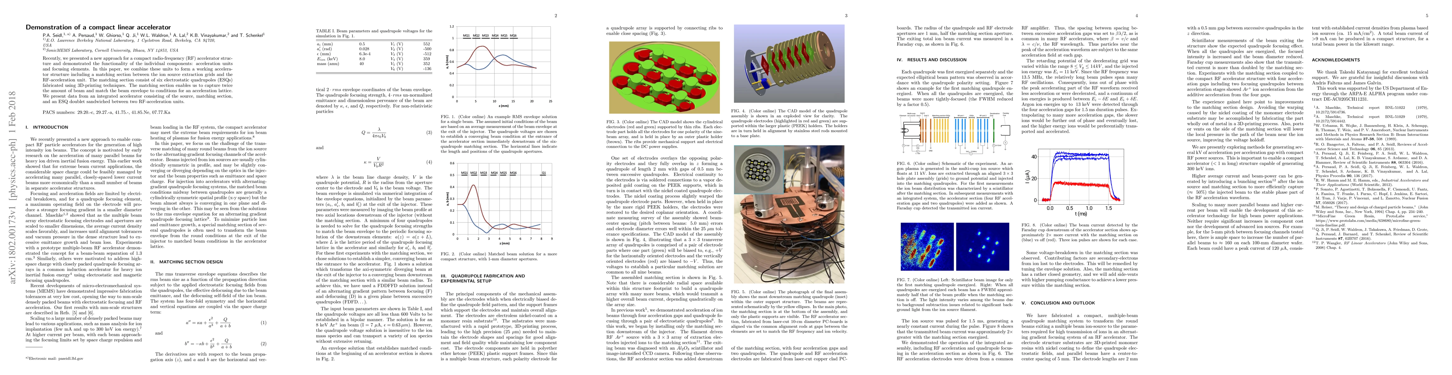 Recently, we presented a new approach for a compact radio-frequency (RF) accelerator structure and demonstrated the functionality of the individual components: acceleration units and focusing elements. In this paper, we combine these units to form a working accelerator structure including a matching section between the ion source extraction grids and the RF-acceleration unit. The matching section consist of six electrostatic quadrupoles (ESQs) fabricated using 3D-printing techniques. The matching section enables us to capture twice the amount of beam and match the beam envelope to conditions for an acceleration lattice. We present data from an integrated accelerator consisting of the source, matching section, and an ESQ doublet sandwiched between two RF-acceleration units.