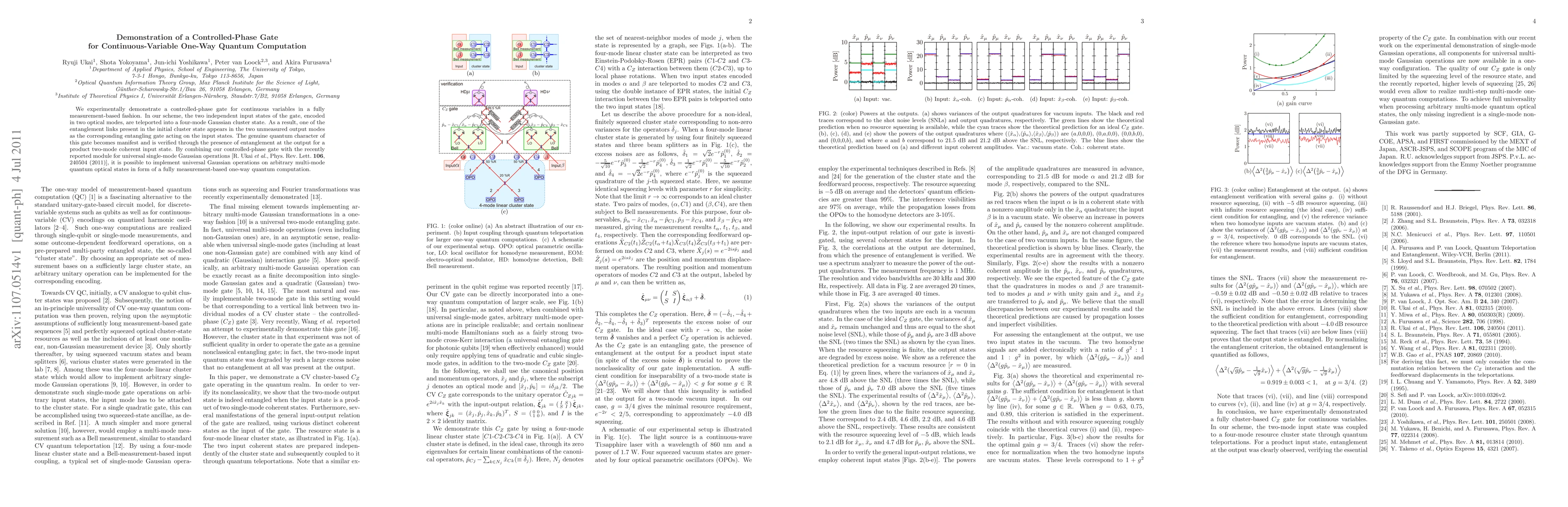 This paper demonstrates a controlled-phase gate for continuous-variable quantum computation using a measurement-based approach, teleporting input states into a four-mode Gaussian cluster state to achieve entanglement. The gate's quantum nature is verified through output entanglement, enabling universal Gaussian operations for multi-mode quantum optical states.