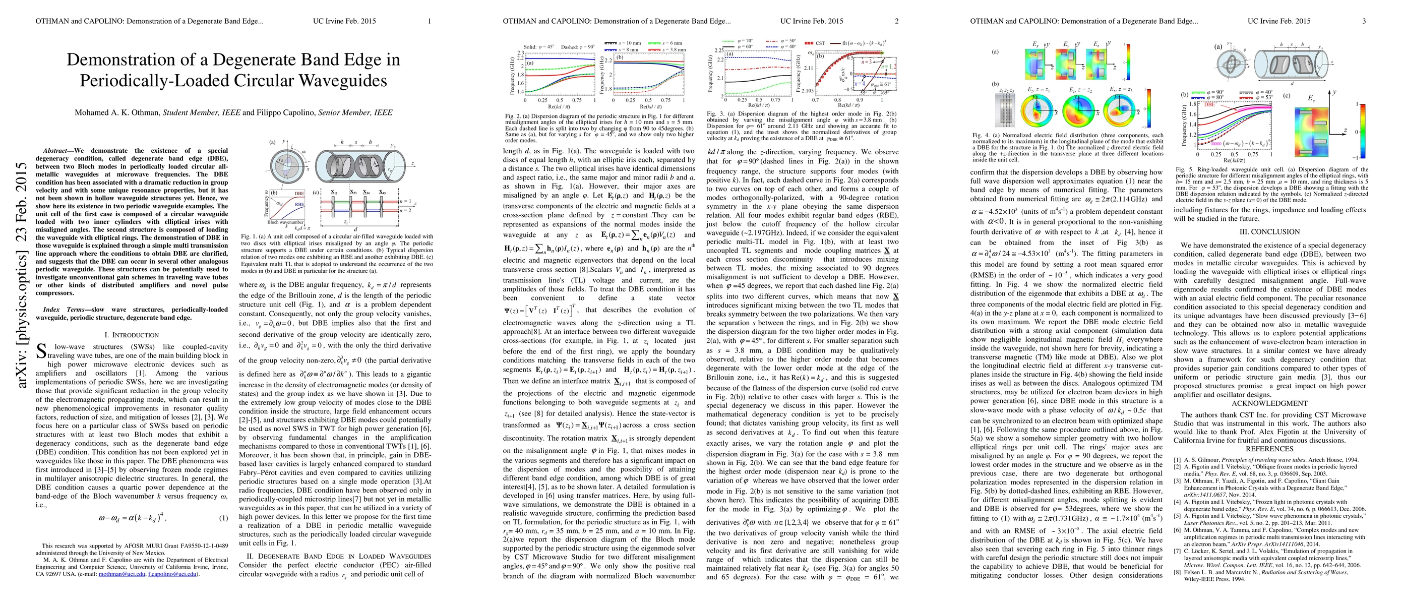 This paper demonstrates the existence of a degenerate band edge (DBE) in periodically loaded circular metallic waveguides at microwave frequencies, showing unique resonance properties and reduced group velocity. The DBE is illustrated in two waveguide structures: one with elliptical irises and another with elliptical rings, suggesting potential applications in traveling wave tubes and distributed amplifiers.