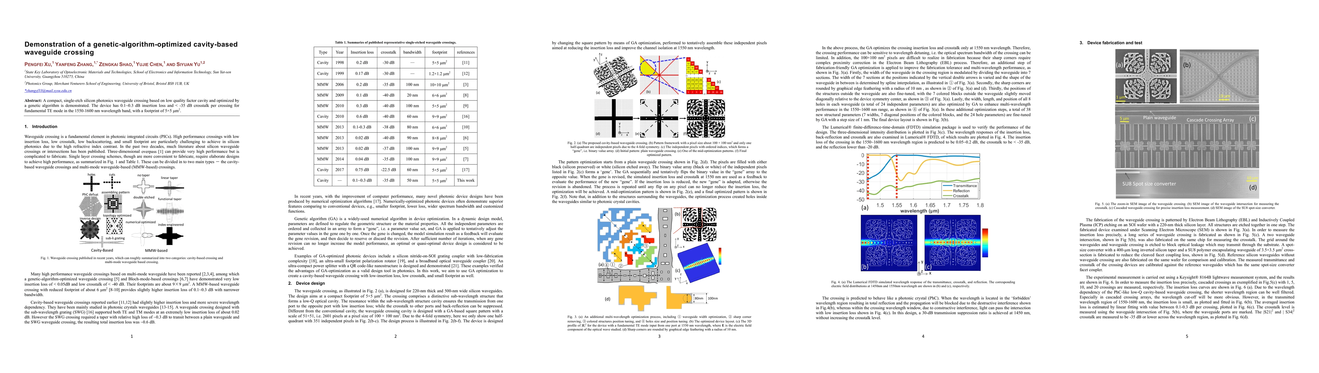 A compact waveguide crossing with low insertion loss and crosstalk is demonstrated using a genetic algorithm-optimized cavity-based design.