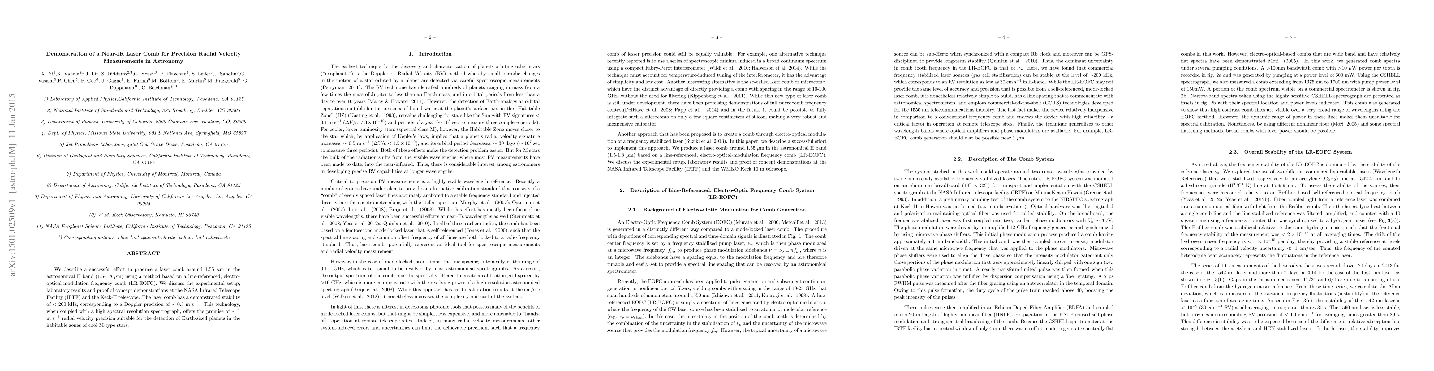 This paper demonstrates a near-IR laser comb at 1.55 μm for precise radial velocity measurements in astronomy, achieving stability under 200 kHz and promising <1 m/s precision, suitable for detecting Earth-sized planets around cool M-type stars.
