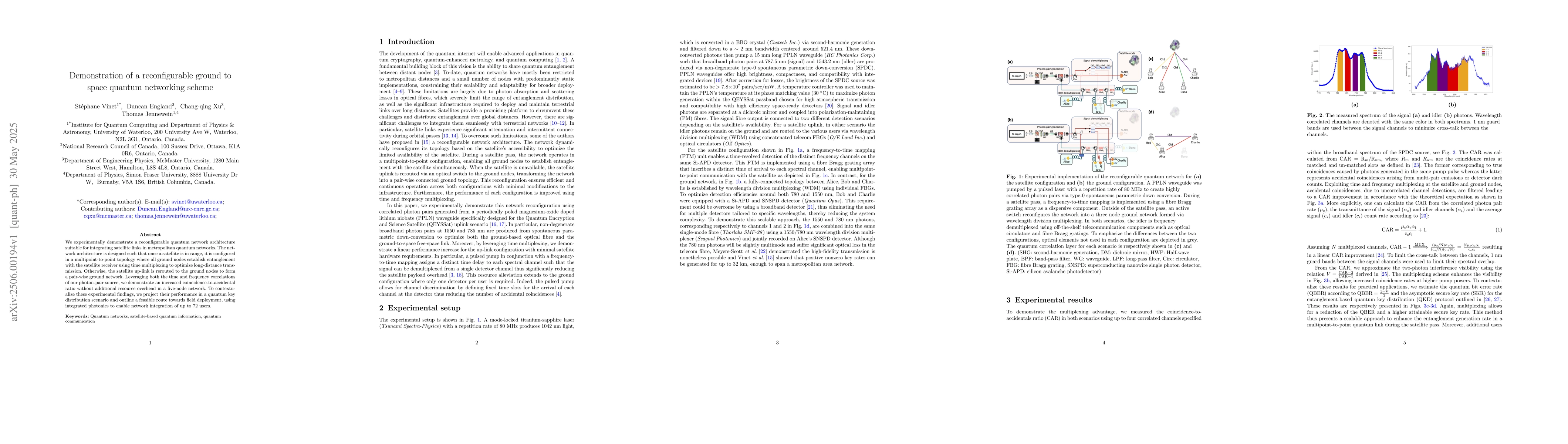 We experimentally demonstrate a reconfigurable quantum network architecture suitable for integrating satellite links in metropolitan quantum networks. The network architecture is designed such that once a satellite is in range, it is configured in a multipoint-to-point topology where all ground nodes establish entanglement with the satellite receiver using time multiplexing to optimize long-distance transmission. Otherwise, the satellite up-link is rerouted to the ground nodes to form a pair-wise ground network. Leveraging both the time and frequency correlations of our photon-pair source, we demonstrate an increased coincidence-to-accidental ratio without additional resource overhead in a five-node network. To contextualize these experimental findings, we project their performance in a quantum key distribution scenario and outline a feasible route towards field deployment, using integrated photonics to enable network integration of up to 72 users.