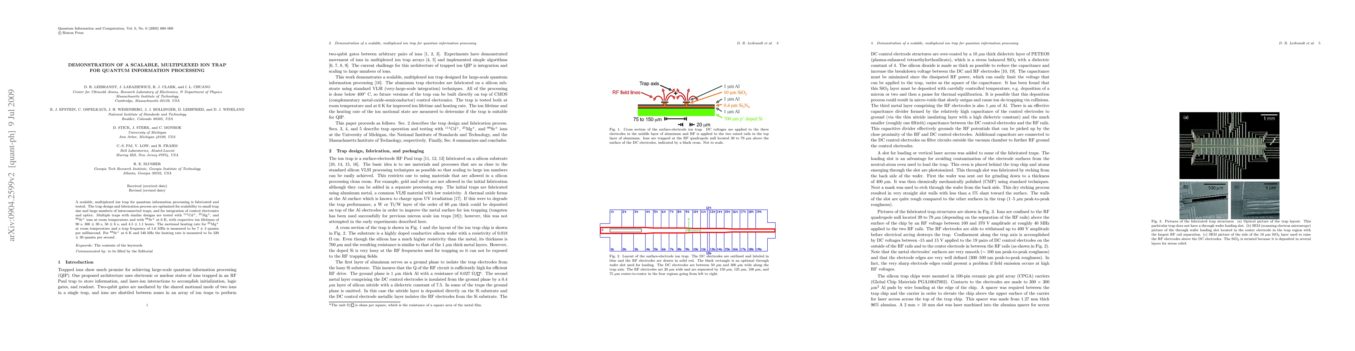 This paper demonstrates a scalable, multiplexed ion trap designed for quantum information processing, optimized for small size and large numbers of traps. Tests with Cd+, Mg+, and Sr+ ions show varying ion lifetimes and heating rates, indicating the trap's potential for quantum computing applications.
