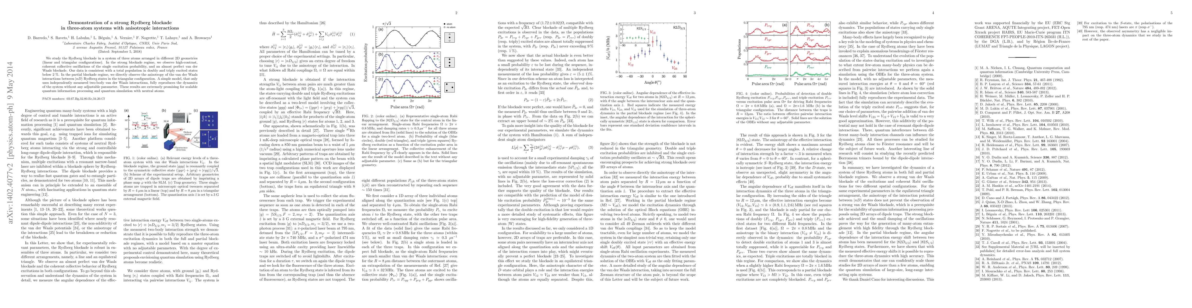 This paper demonstrates a strong Rydberg blockade in three-atom systems with anisotropic interactions, showing coherent collective oscillations and minimal doubly/triply excited states. The study reveals anisotropic van der Waals interactions in triangular configurations, with a model matching system dynamics without adjustable parameters, promising for quantum information processing.