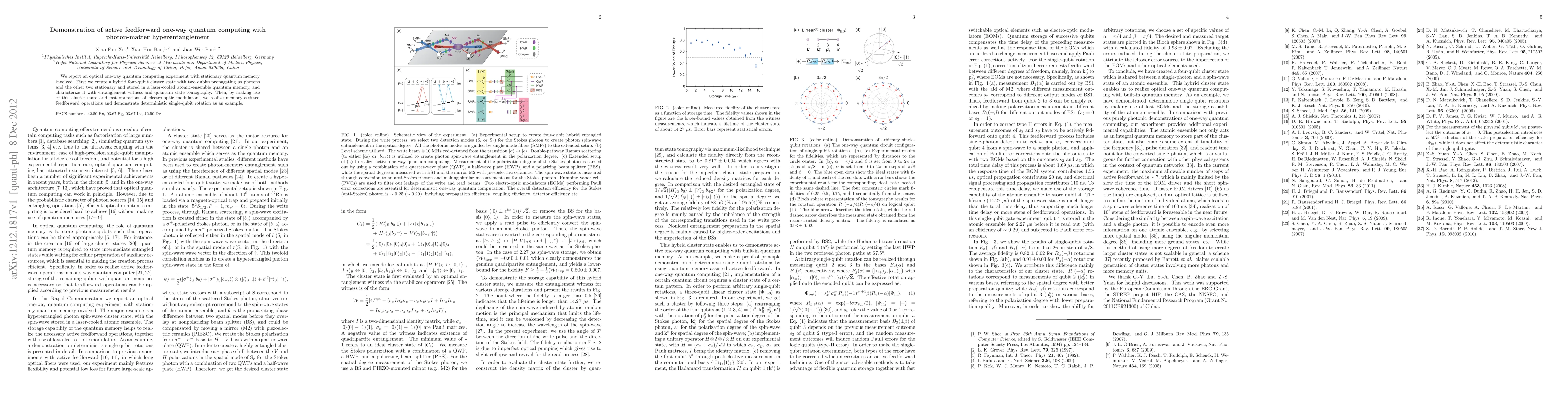 This paper demonstrates an optical one-way quantum computing experiment using photon-matter hyperentanglement, creating a hybrid four-qubit cluster state with photon qubits and stationary qubits in a laser-cooled atomic ensemble, and achieving deterministic single-qubit rotation through memory-assisted feedforward operations.