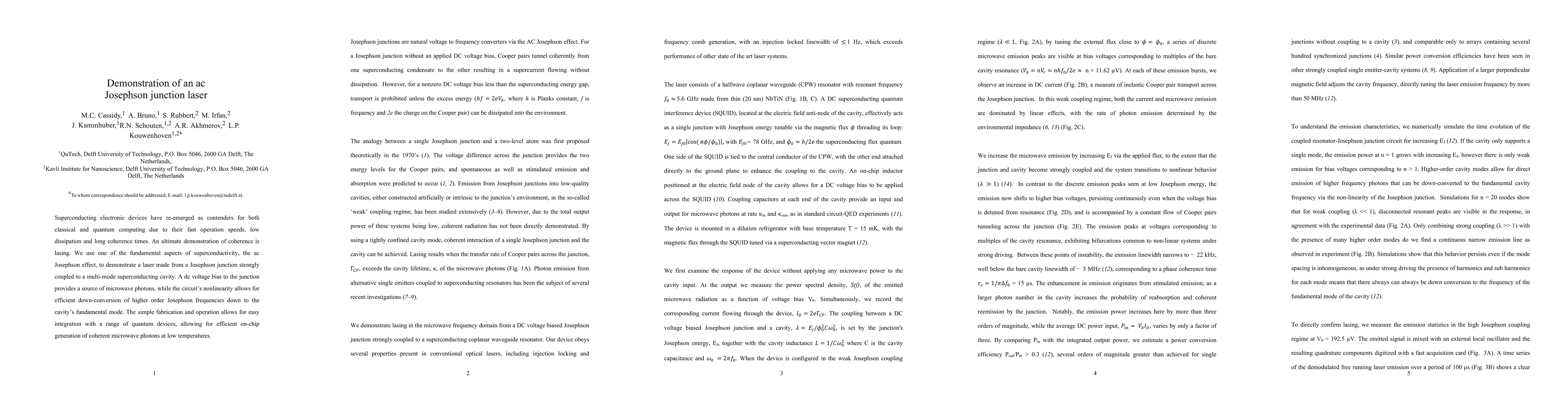 This paper demonstrates a superconducting ac Josephson junction laser that uses the ac Josephson effect to generate coherent microwave photons. The setup involves a Josephson junction coupled to a multi-mode superconducting cavity, enabling efficient down-conversion of higher frequencies to the cavity's fundamental mode, facilitating integration with quantum devices.