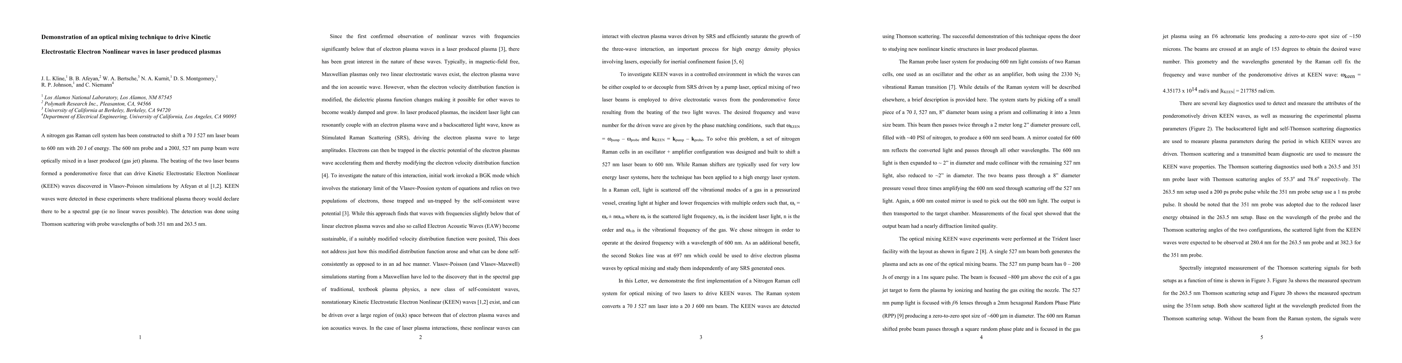 A nitrogen gas Raman cell system has been constructed to shift a 70 J 527 nm laser beam to 600 nm with 20 J of energy. The 600 nm probe and a 200J, 527 nm pump beam were optically mixed in a laser produced (gas jet) plasma. The beating of the two laser beams formed a ponderomotive force that can drive Kinetic Electrostatic Electron Nonlinear (KEEN) waves discovered in Vlasov-Poisson simulations by Afeyan et al [1,2]. KEEN waves were detected in these experiments where traditional plasma theory would declare there to be a spectral gap (ie no linear waves possible). The detection was done using Thomson scattering with probe wavelengths of both 351 nm and 263.5 nm.