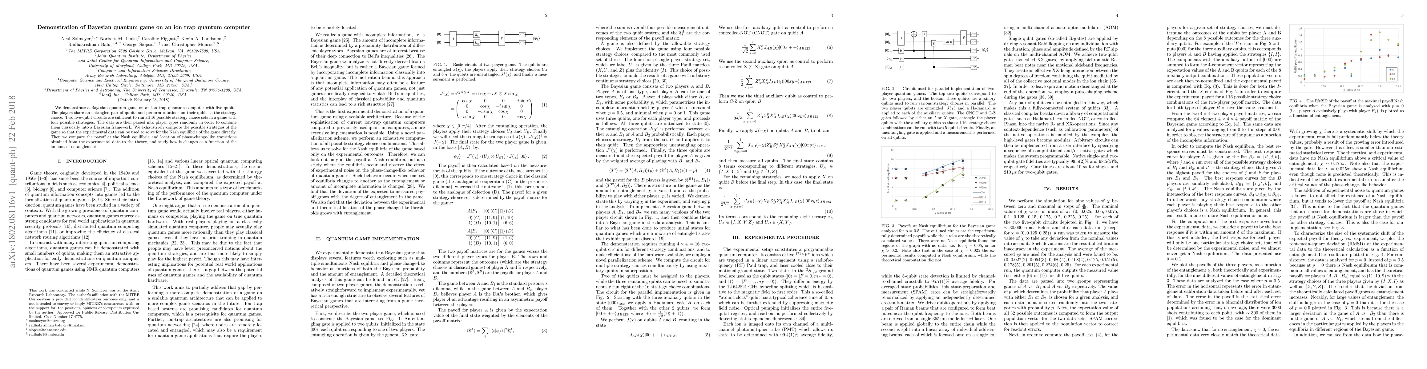 We demonstrate a Bayesian quantum game on an ion trap quantum computer with five qubits. The players share an entangled pair of qubits and perform rotations on their qubit as the strategy choice. Two five-qubit circuits are sufficient to run all 16 possible strategy choice sets in a game with four possible strategies. The data are then parsed into player types randomly in order to combine them classically into a Bayesian framework. We exhaustively compute the possible strategies of the game so that the experimental data can be used to solve for the Nash equilibria of the game directly. Then we compare the payoff at the Nash equilibria and location of phase-change-like transitions obtained from the experimental data to the theory, and study how it changes as a function of the amount of entanglement.