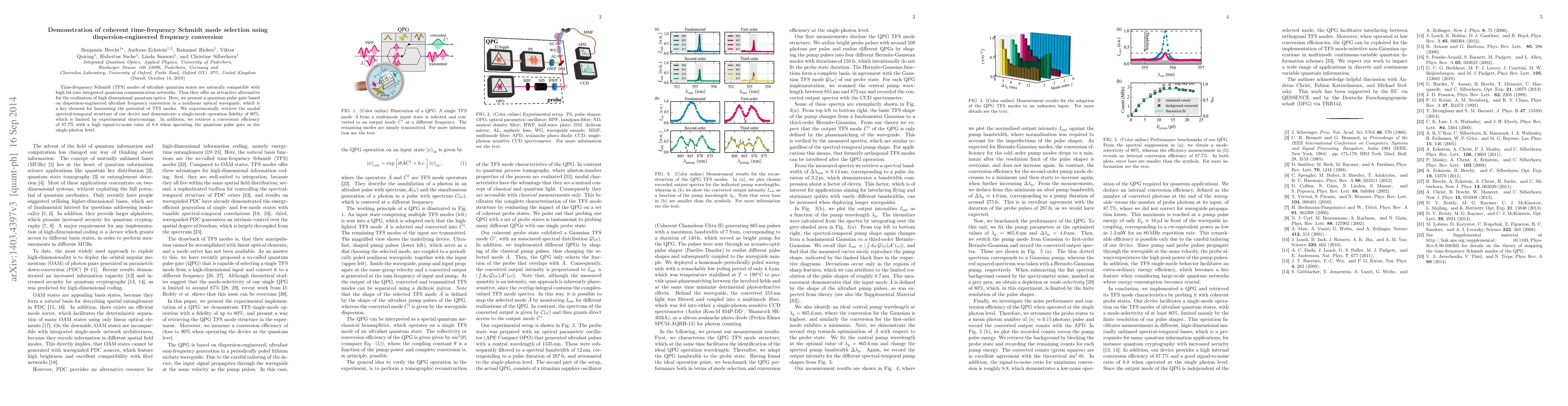 This paper demonstrates a quantum pulse gate using dispersion-engineered frequency conversion in a nonlinear optical waveguide to select coherent time-frequency Schmidt modes, essential for high-dimensional quantum optics. The device achieves a single-mode operation fidelity of 80% and a conversion efficiency of 87.7% with a signal-to-noise ratio of 8.8 at the single-photon level.