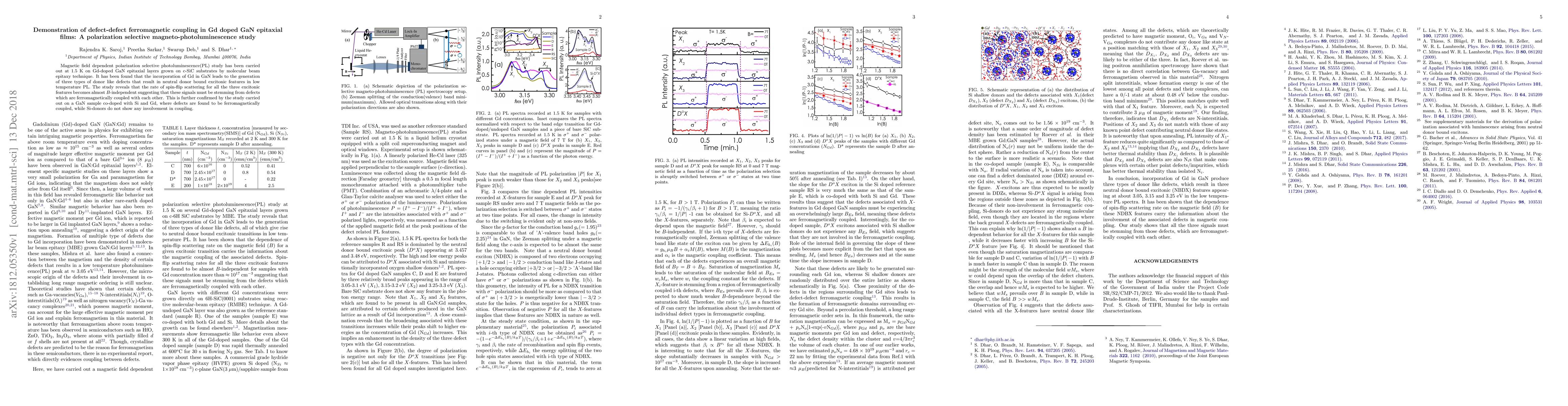 Magnetic field dependent polarization selective photoluminescence(PL) study has been carried out at 1.5~K on Gd-doped GaN epitaxial layers grown on c-SiC substrates by molecular beam epitaxy technique. It has been found that the incorporation of Gd in GaN leads to the generation of three types of donor like defects that result in neutral donor bound excitonic features in low temperature PL. The study reveals that the rate of spin-flip scattering for all the three excitonic features becomes almost $B$-independent suggesting that these signals must be stemming from defects which are ferromagnetically coupled with each other. This is further confirmed by the study carried out on a GaN sample co-doped with Si and Gd, where defects are found to be ferromagnetically coupled, while Si-donors do not show any involvement in coupling.